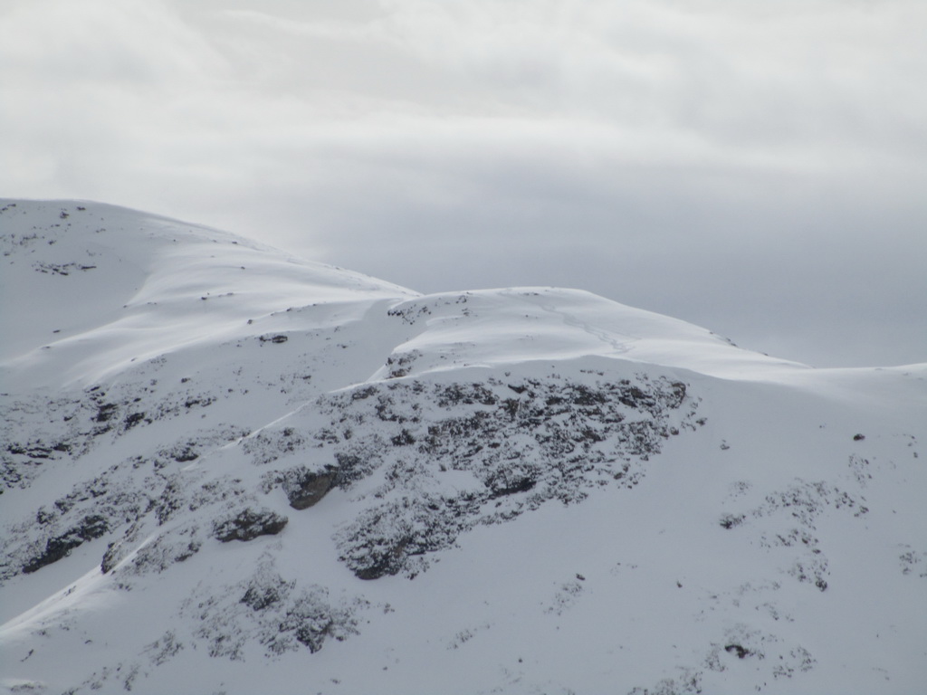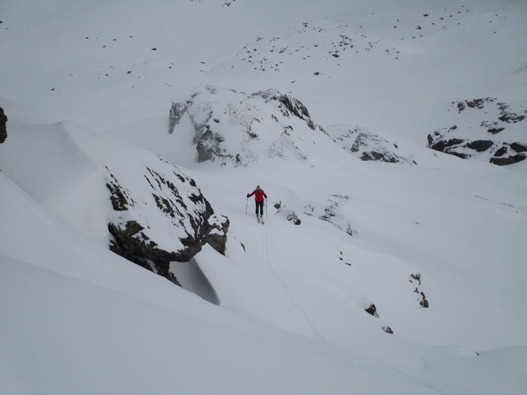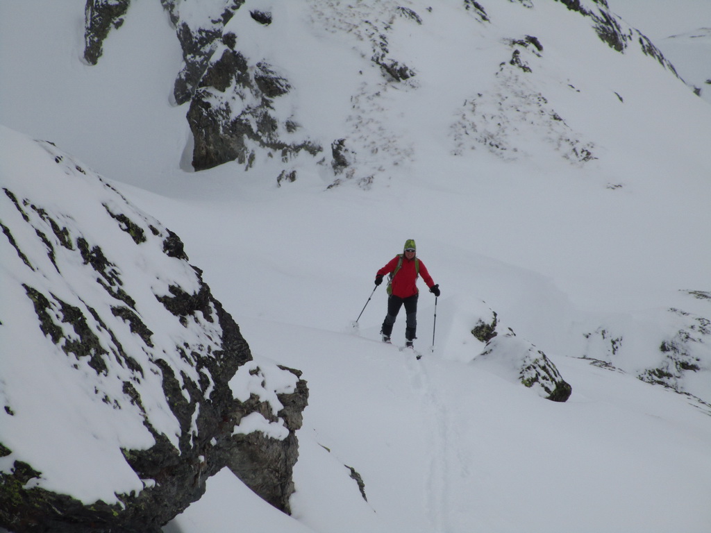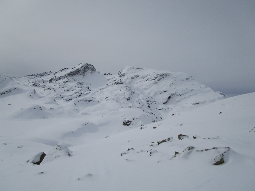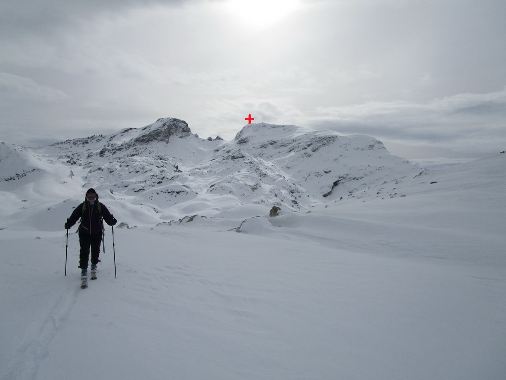 Od jazera hore členitým terénom. Podklad je tu vápencový. Pripomína Dolomity. Prešlapávame stopu a snažíme sa viesť ju čo najmiernejším terénom. Žlabom vystupujeme na vrcholový hrebeň. Chvíľu ideme aj napešo s lyžami na chrbte. Na hrebeni už postupujeme bez problémov až na vrchol. Je treba dávať akurát pozor na preveje a neísť moc vpravo. Vrcholové plato je rozľahlé a človek ani nemá pociť, že ho ohraničujú strmé steny.