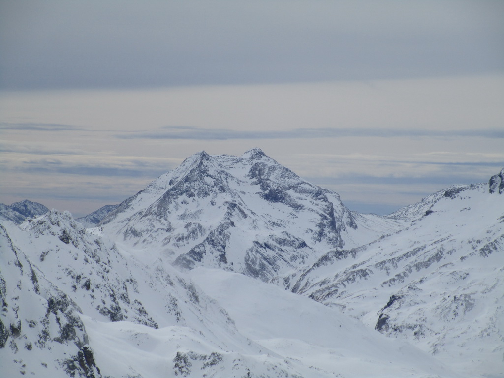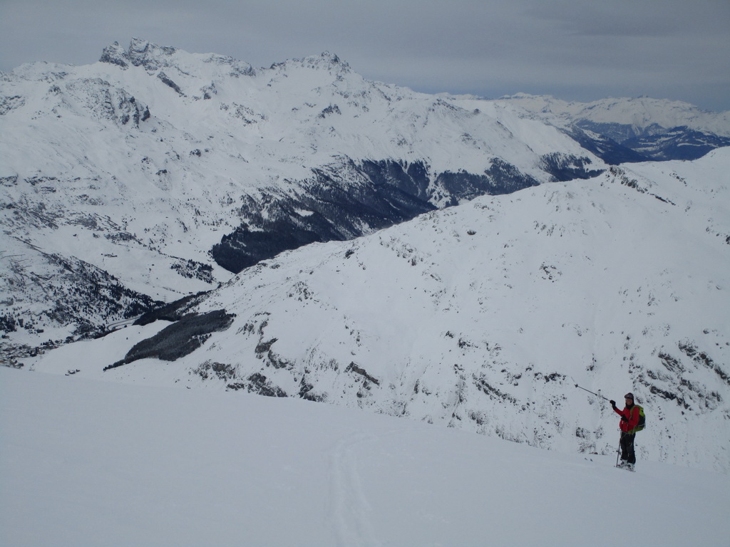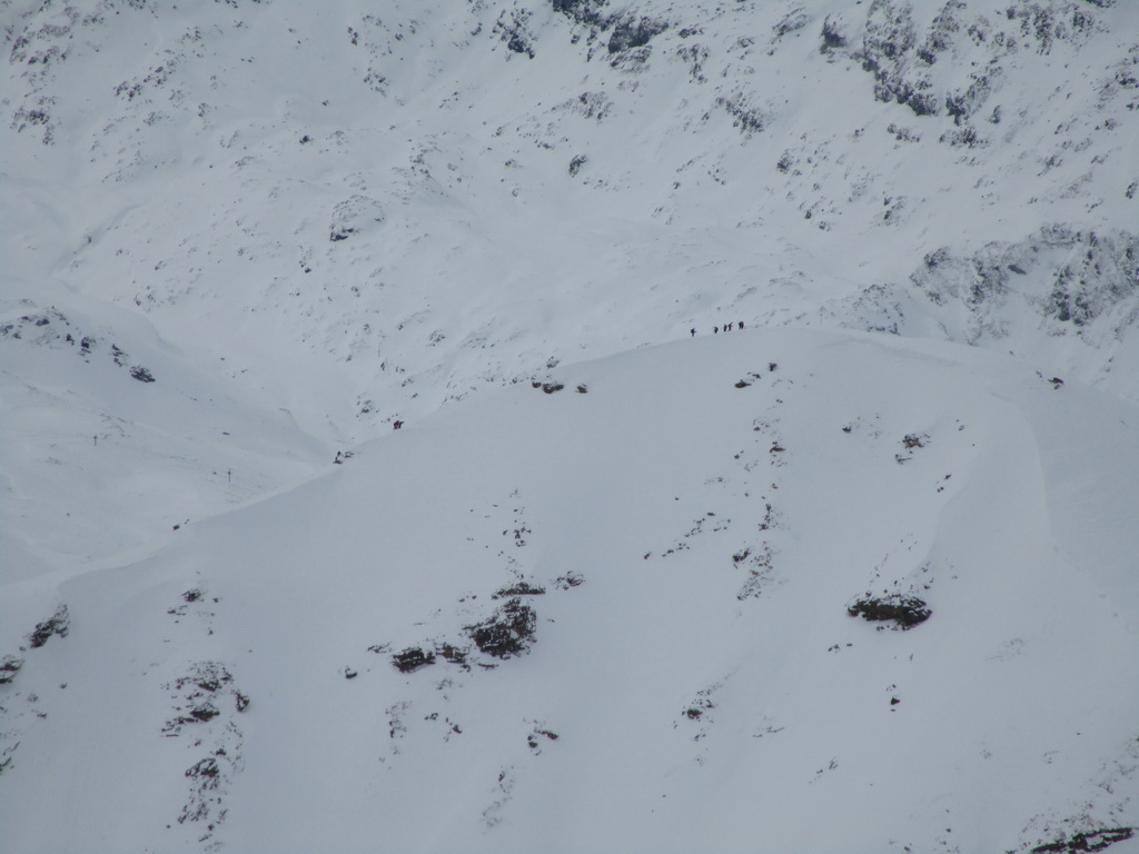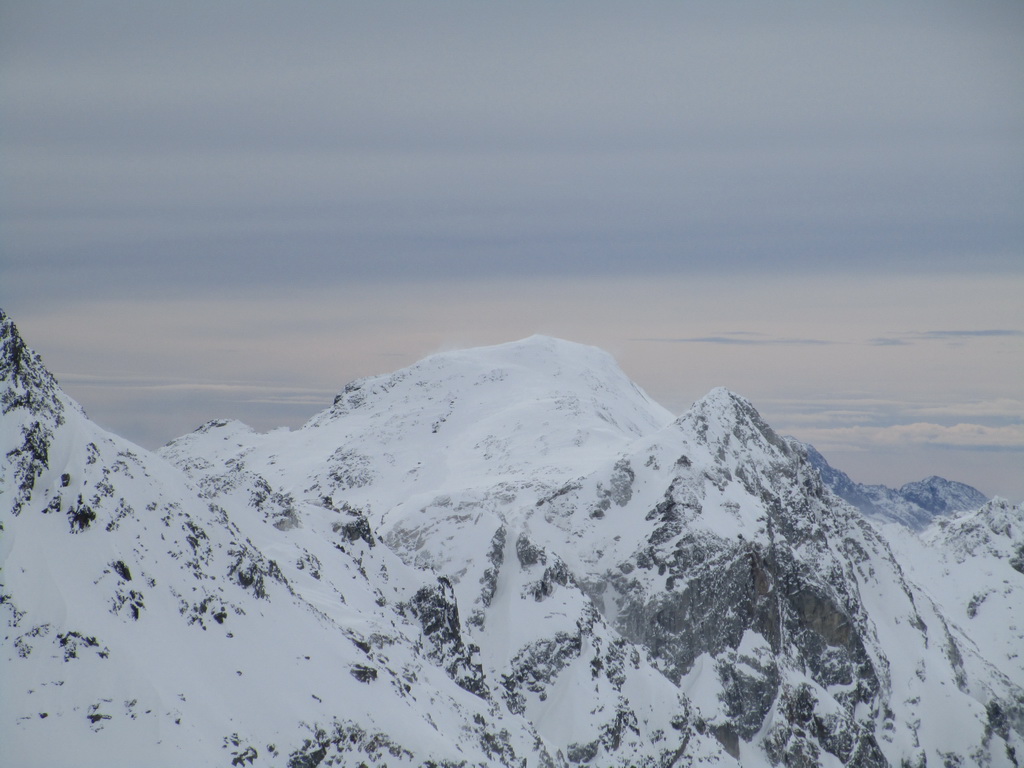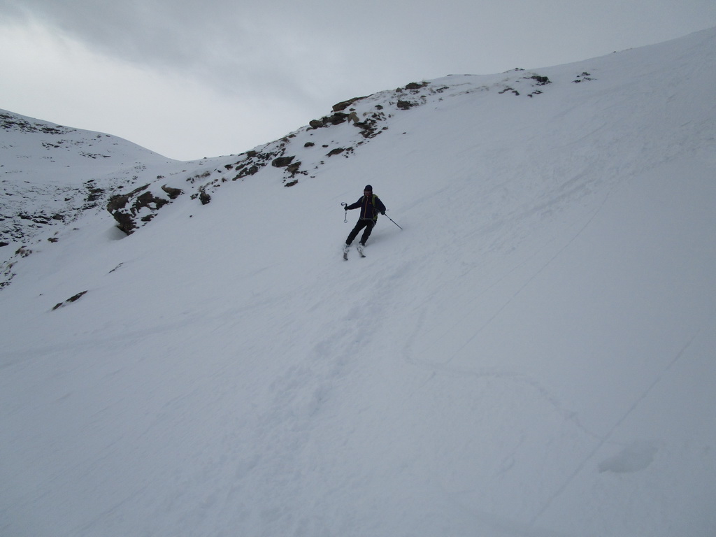 Od jazera hore členitým terénom. Podklad je tu vápencový. Pripomína Dolomity. Prešlapávame stopu a snažíme sa viesť ju čo najmiernejším terénom. Žlabom vystupujeme na vrcholový hrebeň. Chvíľu ideme aj napešo s lyžami na chrbte. Na hrebeni už postupujeme bez problémov až na vrchol. Je treba dávať akurát pozor na preveje a neísť moc vpravo. Vrcholové plato je rozľahlé a človek ani nemá pociť, že ho ohraničujú strmé steny.