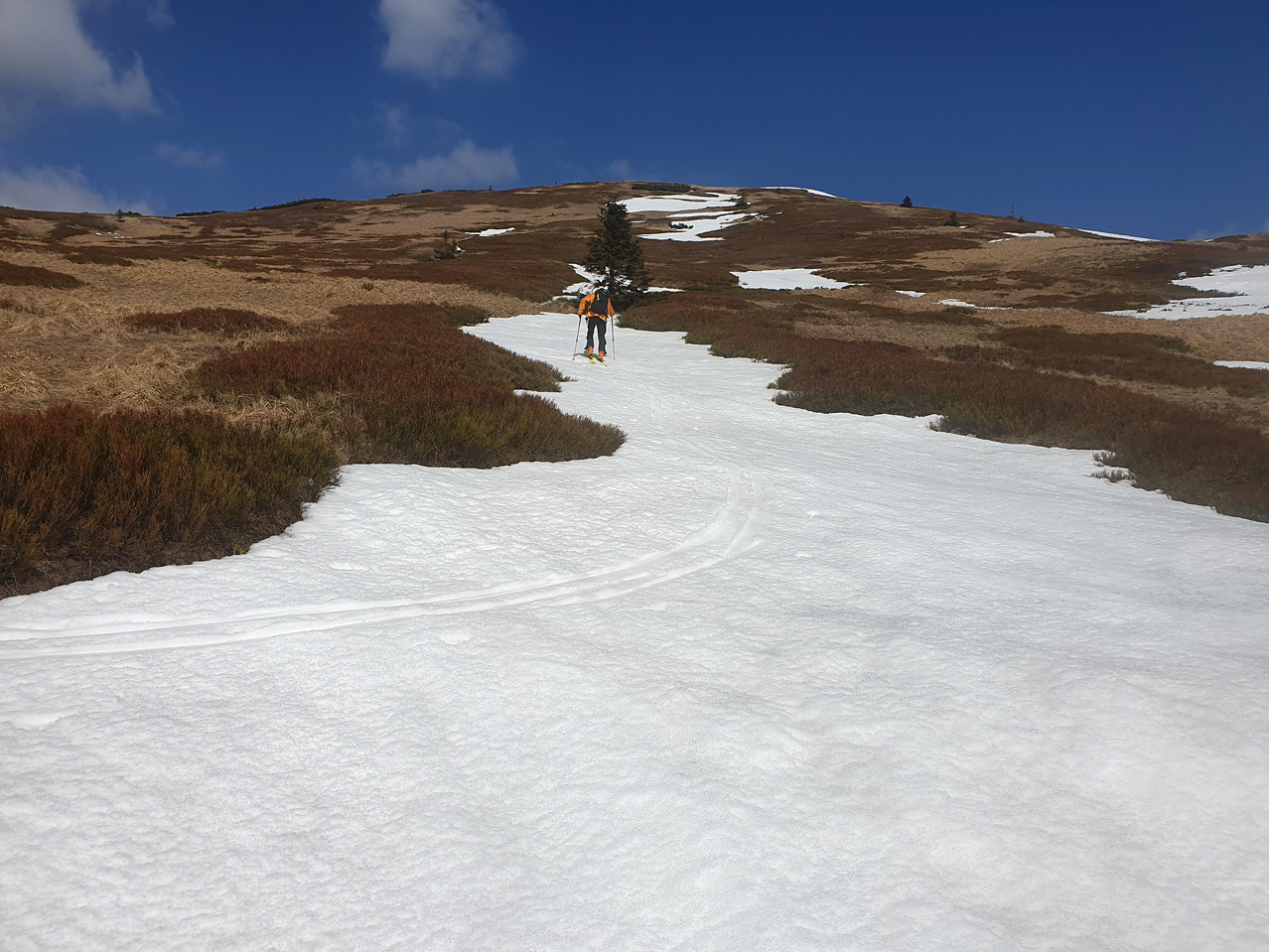 Asi 50 výškových od hrebienka sedla Kraviarske zapíname do lyží,ťaháme sa kus vľavo od smerovníka a takto pohodlne,síce s haršajzňami,lebo severy,si cupkáme v miernom ale celkom štipľavom vetríku na hlavný hrebeň do sedla Bublen a myslíme si,že takto budeme pokračovať až na Malý Kriváň.Na hrebeni prekvapenie,snehu niet a treba nosiť.Aj po trávičke aj po blate a skale.Pár úsekov ideme aj na pásoch,ale veľmi málo.Cestou obzeráme podmienky na nami zamýšľaných zjazdovkách,pričom prvá vedie z malého Kriváňa kúsok jeho južným chrbtom a potom zatáča v smere k svojmu väčšiemu bratovi.Druhá potom z jeho východného výbežku.Snehu je tam dostatok.Slniečko naberá na sile a miestami vyzliekame a naopak,v závislosti od toho,čo nám dovolí severný vetrík.
