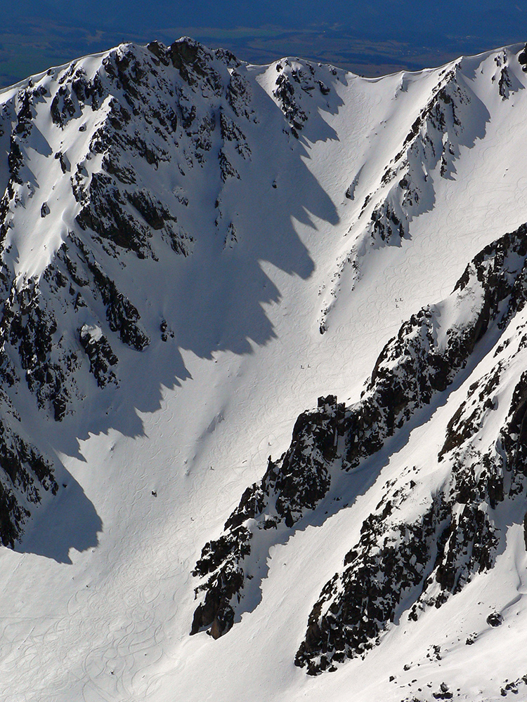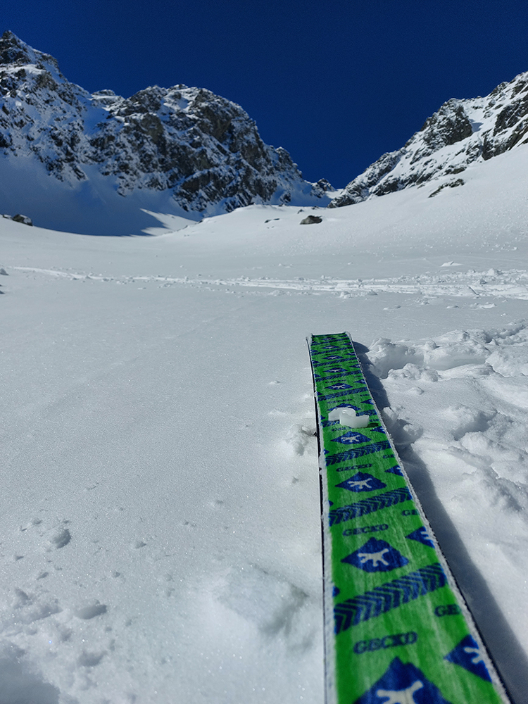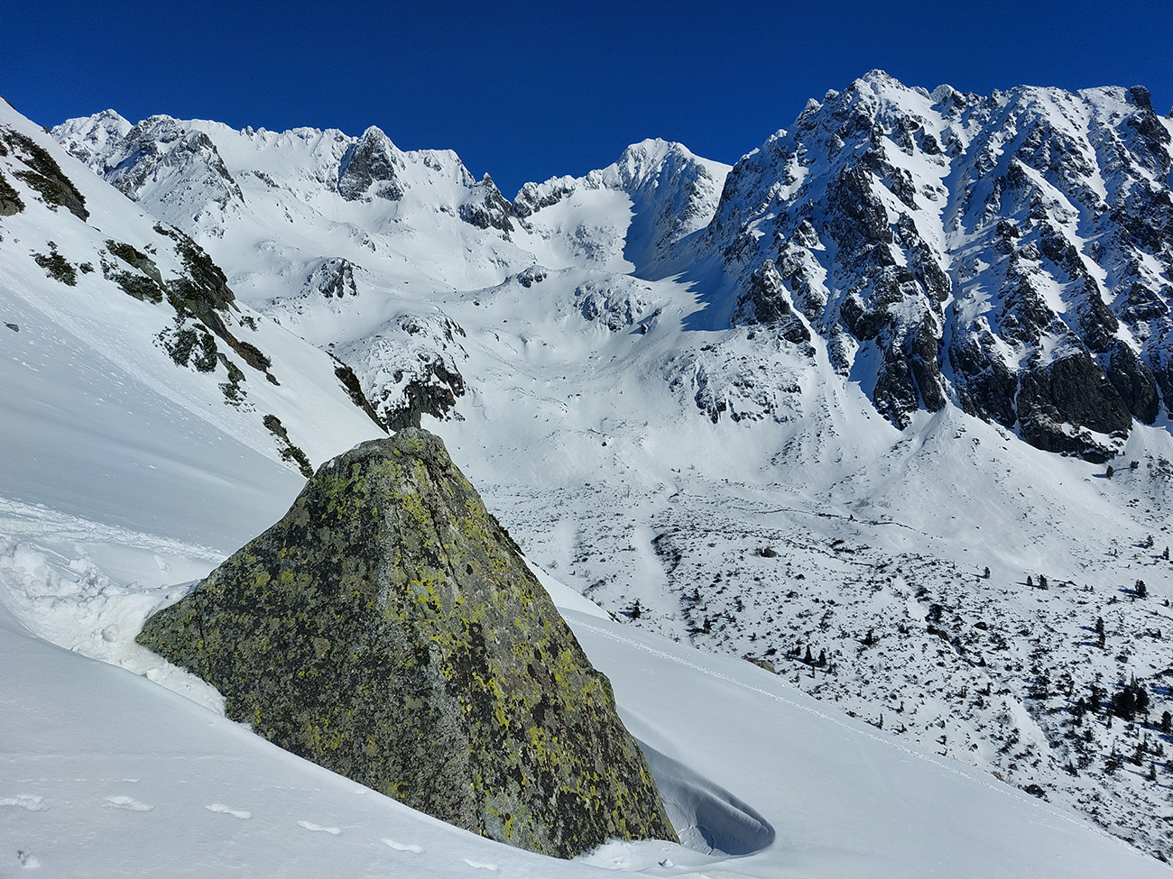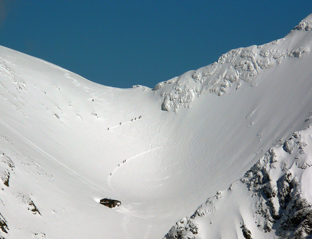 Dole k mostíku sme ale nešli, odbočili sme doľava a cez kosovku sme natraverzovali rovno pod Široký žľab a ten sa nám zapáčil. Lebo podložka príjemne mäkká (natopený firn) a piati predjazdci ťahali stopu priam profesionálne. Vyššie, v strmšom, už o bolo suchšie a boli ta zo dve miesta, kde sme aj rozmýšľali nad haršajzňami (mokrý firn alebo v tieni prášok na tuhej kôrke), ale ešte vyššie viac suchšieho a lepšie državého snehu, skoro prašanu, najmä v tieňoch na južnej strane žľabu. Aj kde bol už odhrnutý lyžujúcimi, dala sa do kôrky pod ním jednoducho hrana zaseknúť, nebol to hrubý ľad. Takže komfortne až hore a tam okrem pár nárazov vetra parádne, tichúčko. Ten ďalší front v nedohľadne.