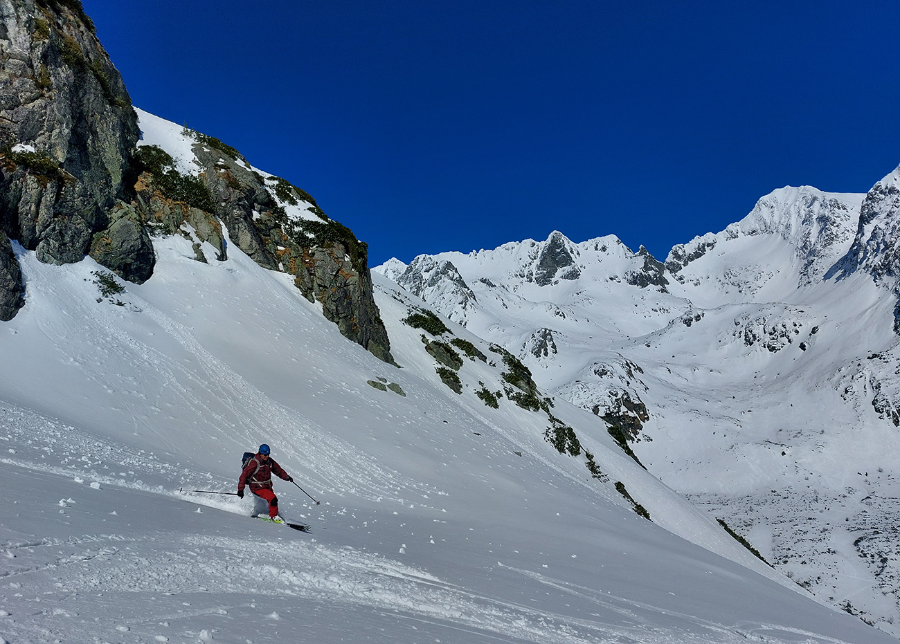 Nečakane dobré podmienky aj na zjazd: najmä horná časť, skoro prašanové orgie. Čím nižšie, tým to bolo ale horšie. V strede už čerstvo tvoriaca sa kôrka trochu chytala za nohy a úplne dole postupne tuhli rozlyžované hrudky firnu z nedávneho splazu. Takže lyžba skoro ako po lavínisku. Partia, ktorá prešla z Mlynickej, ale hovorila, že na tej strane je sneh oveľa horší.