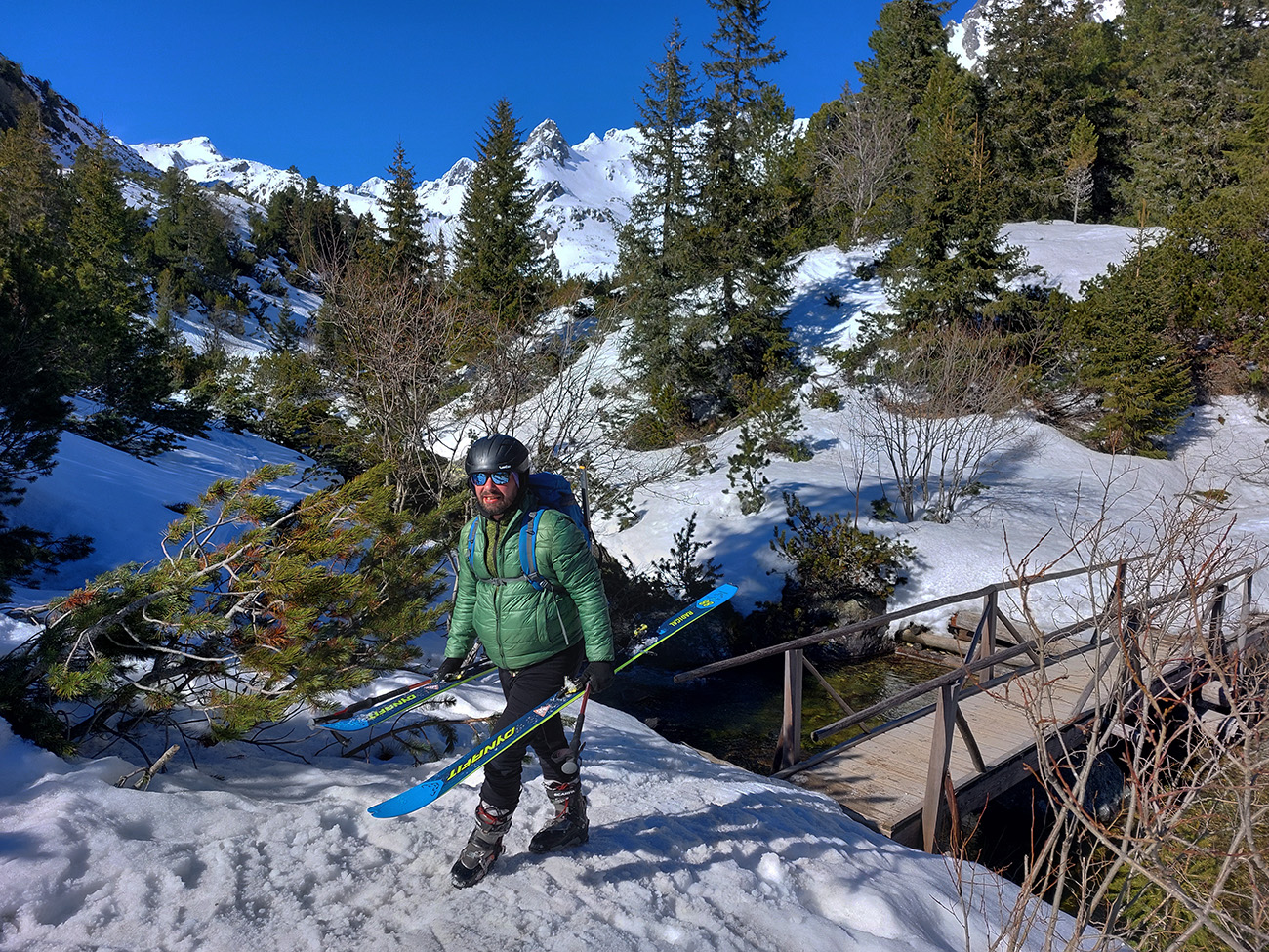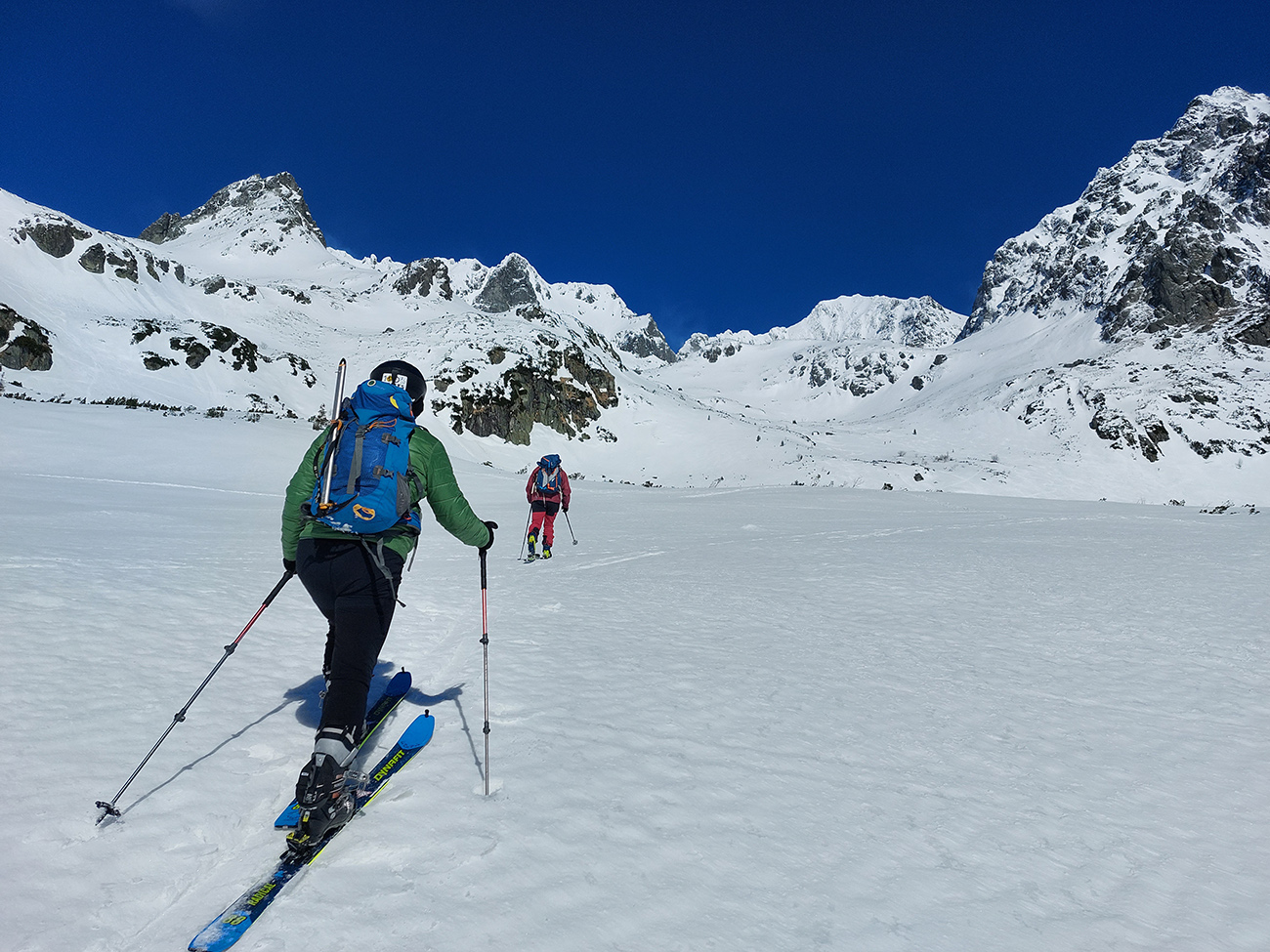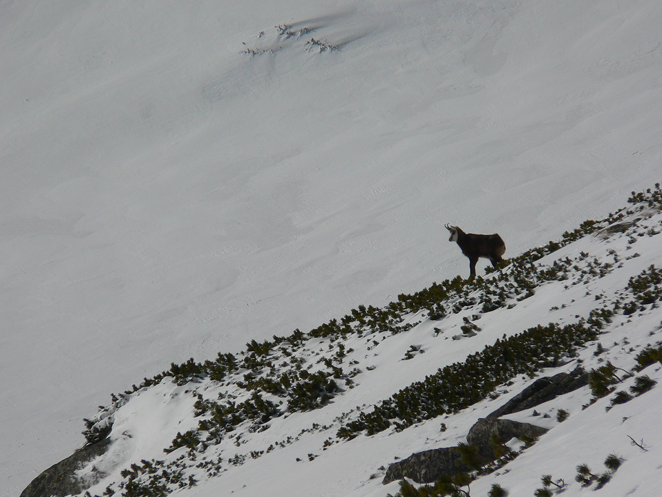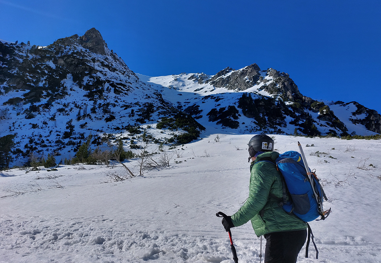 Ešte bolo trochu času aj síl, tak sme od potoka začali dupať v ústrety Žabím plesám, už so slnkom za chrbtom. Ale obe spomenuté dôležité komodity sa rýchlo míňali, tak sme skončili niekde pod prahom Volej kotliny a zahanbene sme začali strácať výšku po červenej značke smerom ku potoku. Celkom fajn jarná lyžba, lebo slnco tam malo ešte svoje slovo.