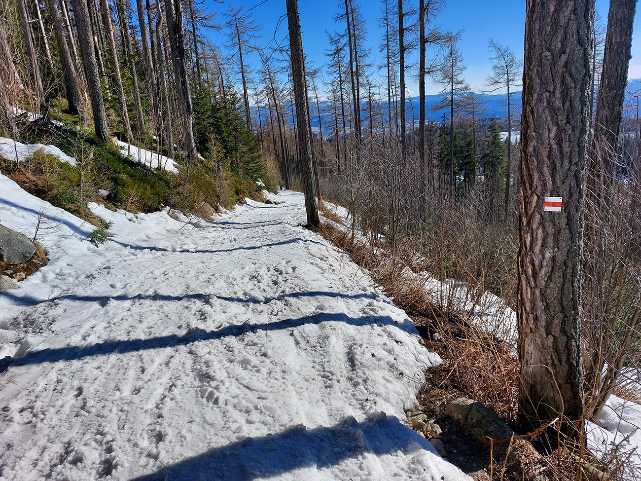 Rozbitý po sobote, chcel som sa ísť len s domácimi snehmi rozlúčiť, ale nejako nedopatrením ma zavialo do Tatier. To len ako výhovorka, prečo z Mengusovskej nebude toho viac – v podstate len Široký žľab a biedny pokus o Volí chrbát. Našťastie som nebol jediný nevládny, tak som nebol za brzdu a pohodové tempo mi véééééľmi vyhovovalo. Z domu sme vyrážali ešte za dažďa, ale mraky mali rýchlo odtiahnuť a malo nastať dočasné ažúro – asi do obeda. Potom ďalší front a pokles teploty pod nulu ešte počas dňa. Ráno bolo čvachtavo a teda poriadne - aj na Štrbskom plese, odkiaľ sme vyrážali. V pláne bola Mengusovská, že tam sa nejako a niekam hádam schováme pred dobiedzavým sz vetrom. Podobný program ako pred dvoma týždňami ( report je tu ), akurát, že „od parkoviska“ už to nešlo, poctivo sme si lyže vyniesli až tam, kde letný chodník vychádza z lesa, ďaleko za Triganom. Lebo v lese toľko špiny na chodníku, že nám bolo pásov ľúto:
