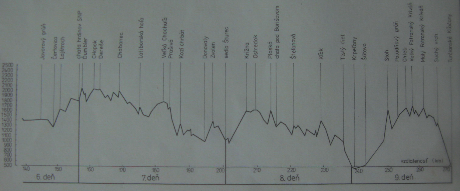 Lajštroch (1601m), Štefánikova chata, Ďumbier (2043m), Chopok (2024m), Dereše (2003m), Chabenec (1955m), Latiborská hoľa (1643m), Veľká Chochuľa (1753m), Kozí chrbát (1330m), Donovaly (960m), Zvolen (1403m), Veľký Šturec, Krížna (1574m), Ostredok (1592m), Ploská (1532m), chata pod Borišovom (1265m),