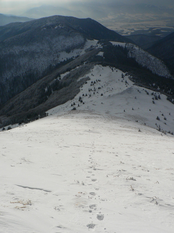 V poslednom lese pod Stohom definitívne strácam značku, chvíľu sa motám a potom naverímboha bojujem hore lesom. Smer je jasný, chodník netreba, že? Keby som mapu doma nenechal, ušetrím pár minút, no čo už... Zato sa čoraz dôraznejšie ozýva megaodrenina na holeni, ktorú som doma nezalepil, veď už vyzerala zahojená. Ďaľší prešľap... Aj preto pri stúpaní po lysine Stohu idú lyže zas na batoh, tu je to už úplne do trávy vylízané a nohu takto menej cítim. Hore som o dobrú hodinu neskôr, ako som rátal. Nič to, po Kriváň pridám a uvidím čo tam.