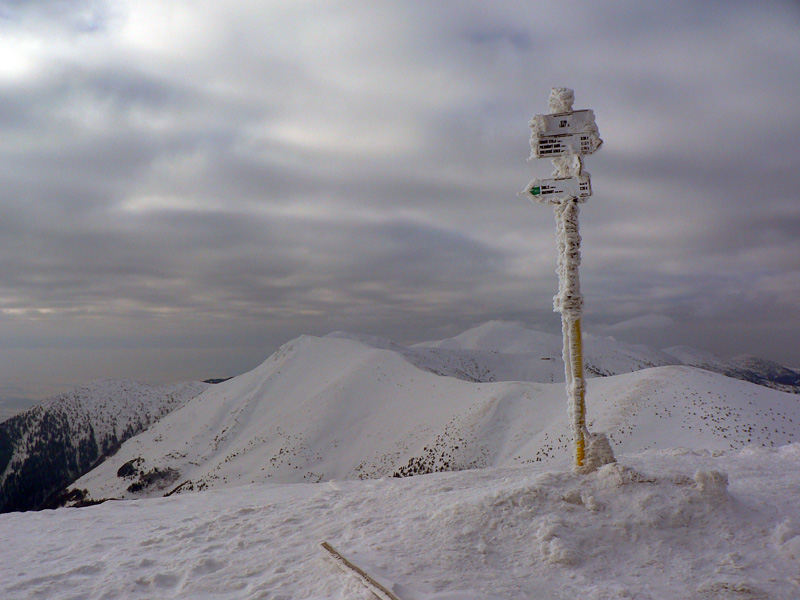 Ale to už som v Snilovskom sedle a rýchlo hore pod Kriváň. Z meteorológmi sľubovanej malej oblačnosti je už dávno veľká, ale tá sivota nad hlavou bola doteraz aspoň vysoko. Na hrane Kriváňa už ale nevidím nič. A začína snežiť. Ojedinele, to hlásili, aspoň to sedí. Noha bolí, nič nevidno, mám veľký časový sklz a malý pásový a hrkotať v tom mlieku po ľade sa mi už fakt nechce. Tak to otáčam, smer Chata pod Chlebom, tam sa uvidí, samozrejme že odchody vlakov zo Šútova som si doma nepozrel, veď načo?