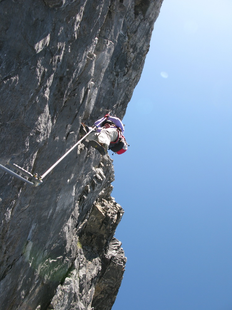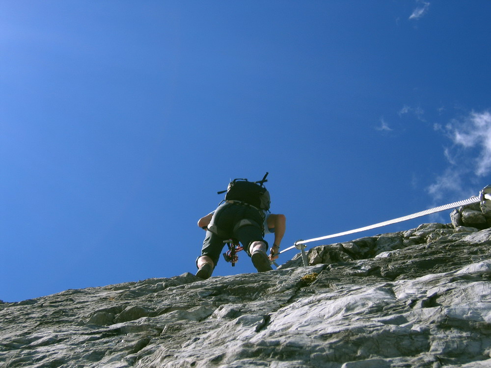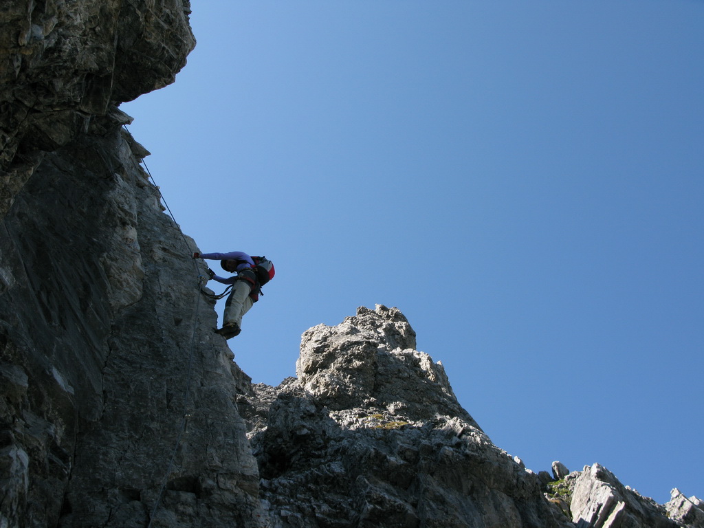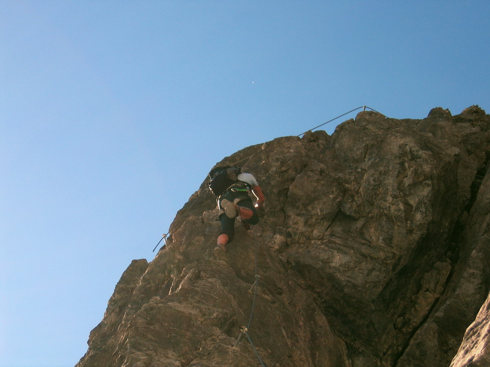Hneď od nástupu to ide pekne dokopca, celkom pekné miestami exponované lezenie, okrem kľúčového miesta (gelbe wand) som sa nestretol s nejakými problémami, na klúčovom mieste som však aj napriek lezečkám nenašiel nič na nohy a musel som niekoľkokrát odsadnúť do skrátenej šlingy. V závere si vychutnáme ešte nádherný pilier a hurá na občerstvenie na Payerku, potom druhé kolo občerstvenia na Tabarete a zostup dole.