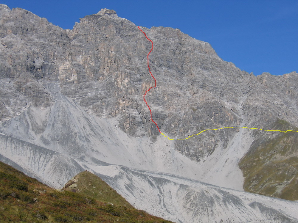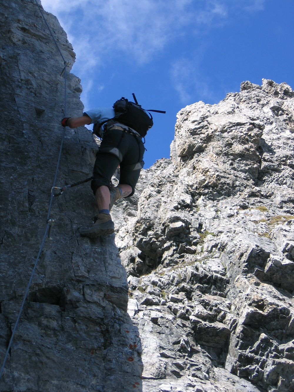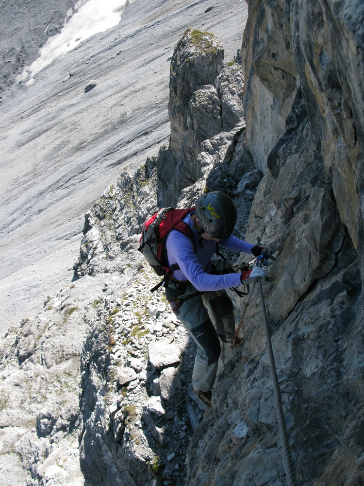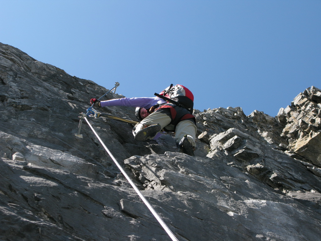 Hneď od nástupu to ide pekne dokopca, celkom pekné miestami exponované lezenie, okrem kľúčového miesta (gelbe wand) som sa nestretol s nejakými problémami, na klúčovom mieste som však aj napriek lezečkám nenašiel nič na nohy a musel som niekoľkokrát odsadnúť do skrátenej šlingy. V závere si vychutnáme ešte nádherný pilier a hurá na občerstvenie na Payerku, potom druhé kolo občerstvenia na Tabarete a zostup dole.