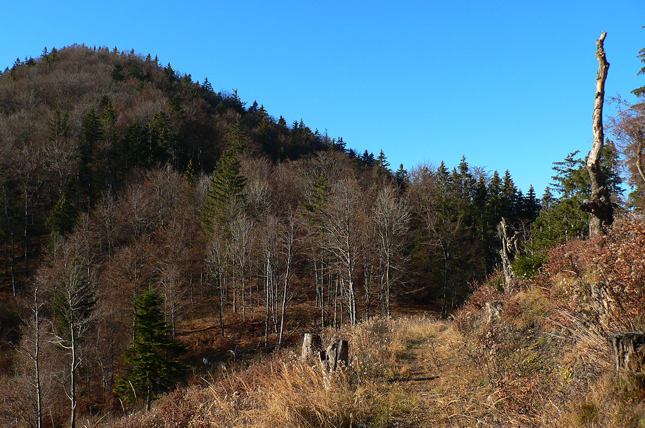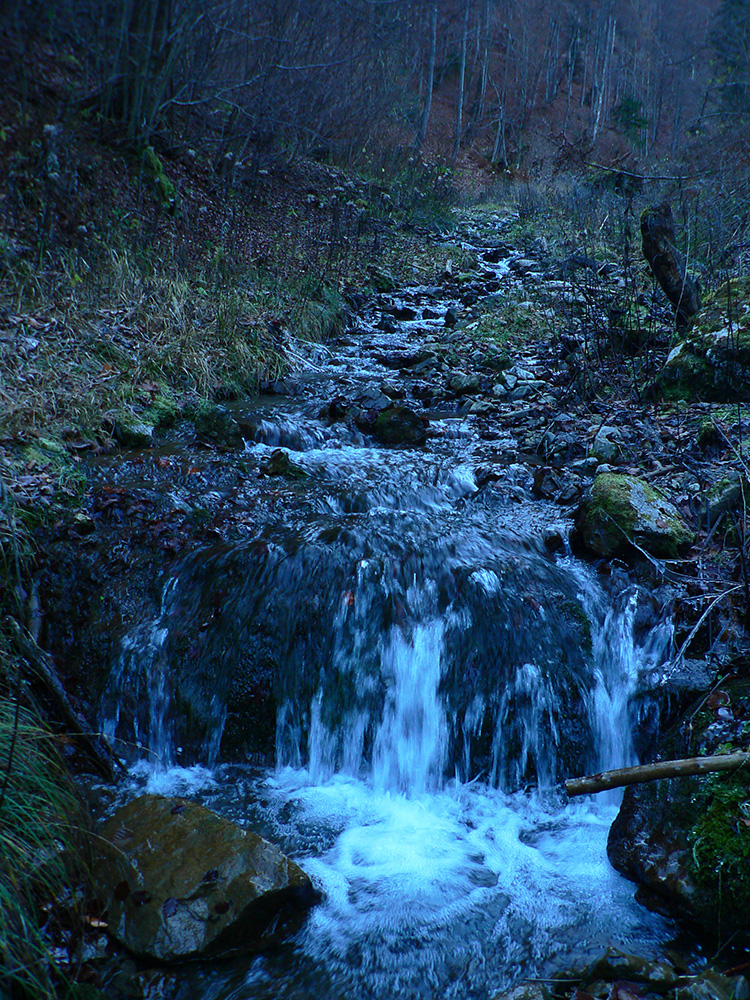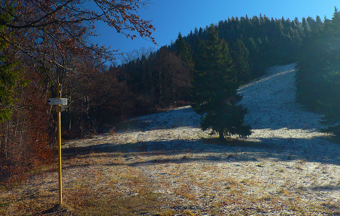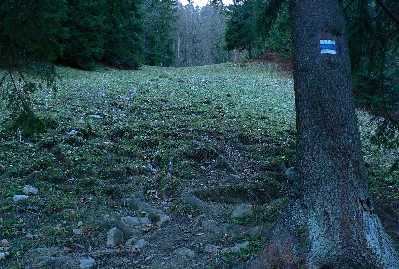 Takže: z dediny je to na Kľak jednoduché, po modrej. Len od konca asfaltky som dočasne tou modrou pohrdol a skúsil to priamo prielomom potoka. Práve preto, lebo v lete by som sa tu utopil v mori žihľavy a lopúchov. Teraz už bolo všetko zľahnuté a čerstvý nočný mráz aj blatá vysušil a podklad trochu spevnil. No, dalo sa, prielomček pekný, aj dáke bralká a jeden vodopádik – trpaslík, ale nič svetoborné.