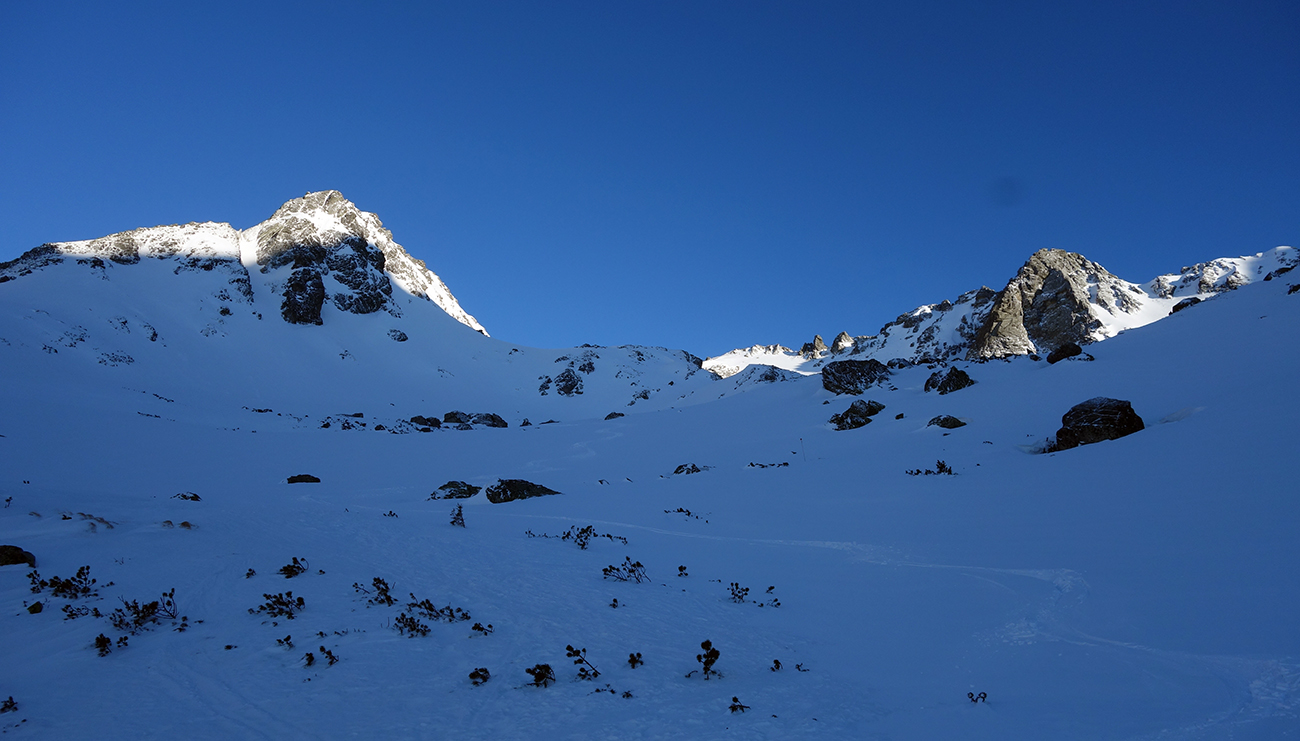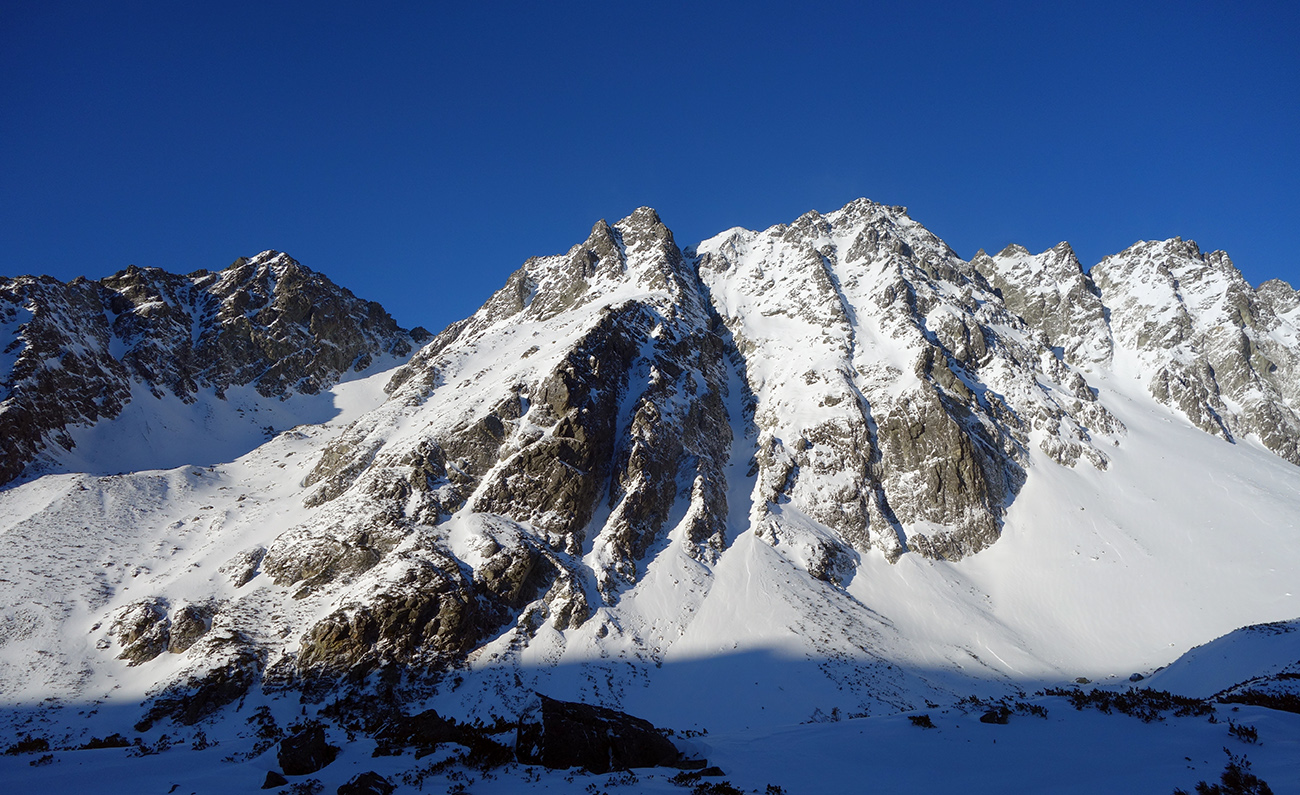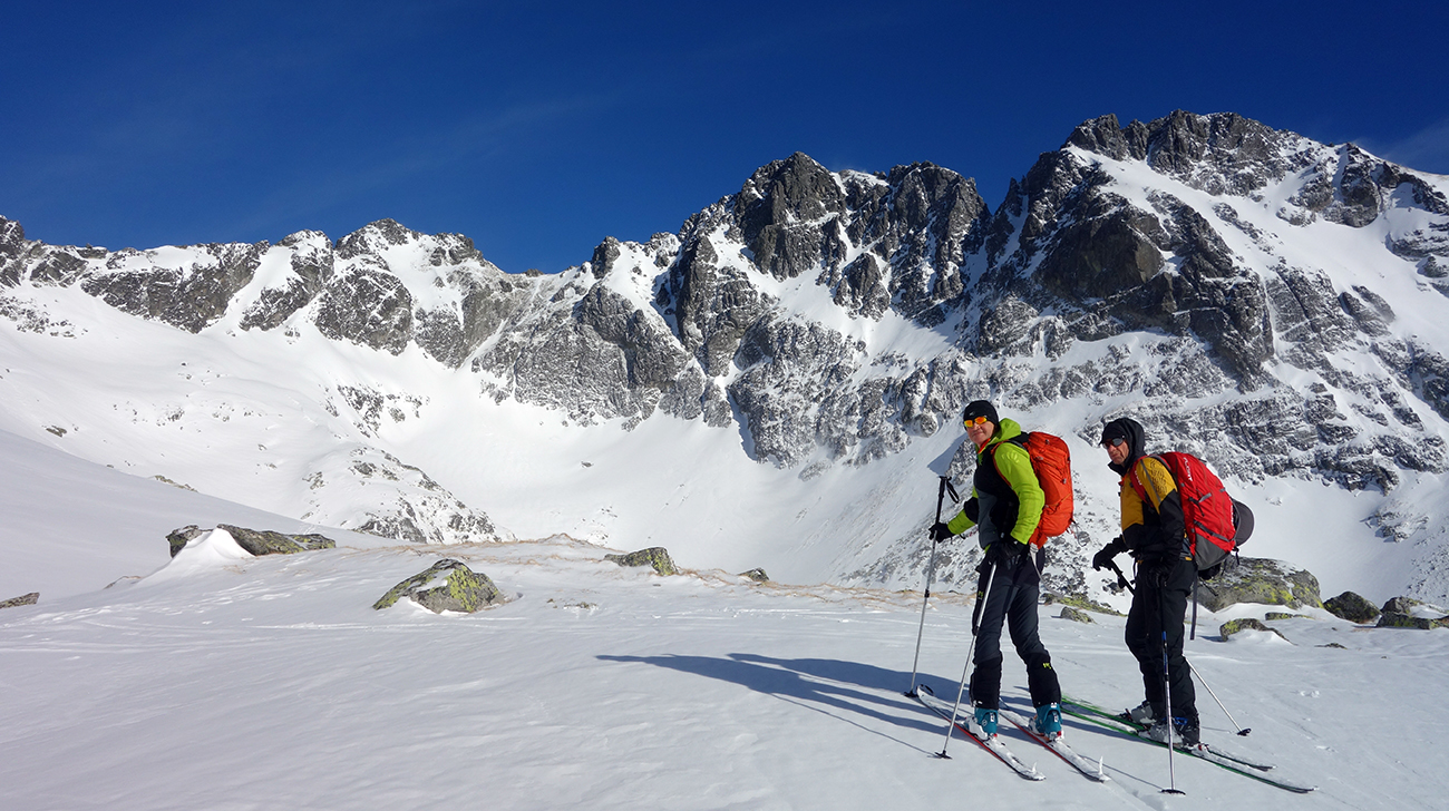 Sobota začína skvostne (azúro a takmer bezvetrie) a užívam si lyžovačku vyľudnenou dolinou. Rampa bezpečne zjazdná a od Žabích plies skvelá lyžovačka ufúkaným prašanom až k hotelu. Tentokrát bez občerstvenia, ale s vidinou výživného dňa nastavujem testovacie K2 Wayback 96-ky od Sportrysy na moje F1-ky. Vyrážame s Peťom Lichým a Robom Turjaníkom dolinou Mengusovskou a nechávame sa viesť čerstvou stopou až do Satanej dolinky. Pri Hincovom plese odbočujeme do Vyšného Kôprovského sedla. Chodník je tradične vyfúkaný až na kamenný podklad. Na chvíľu teda nasadzujeme mačky a lyže idú na batoh. V sedle výmena a moji 50+ parťáci neúnavne diktujú tempo a ťahajú stopu panenským svahom. V krásnom počasí dorazíme na snehový predvrchol. Vieme, čo nás čaká. Nenormálna lyžovačka v jemne sfúknutom púdri nemá chybu a doprajeme si dojazd až pod severku Štrbského štítu.