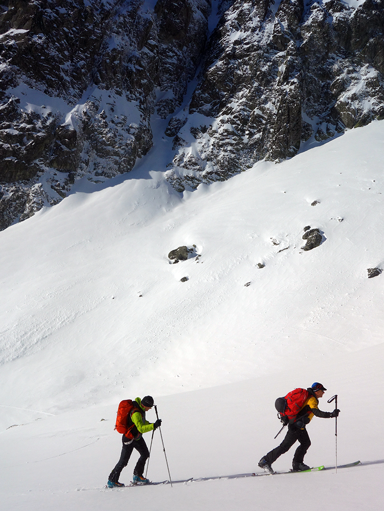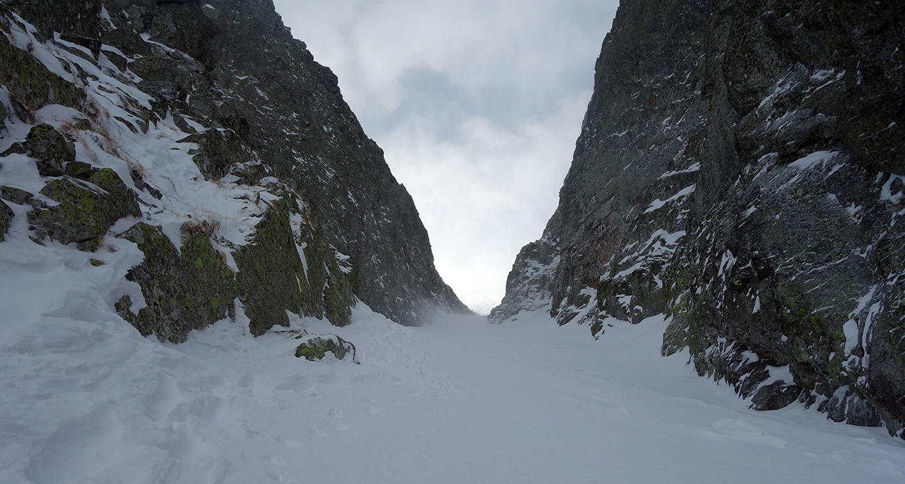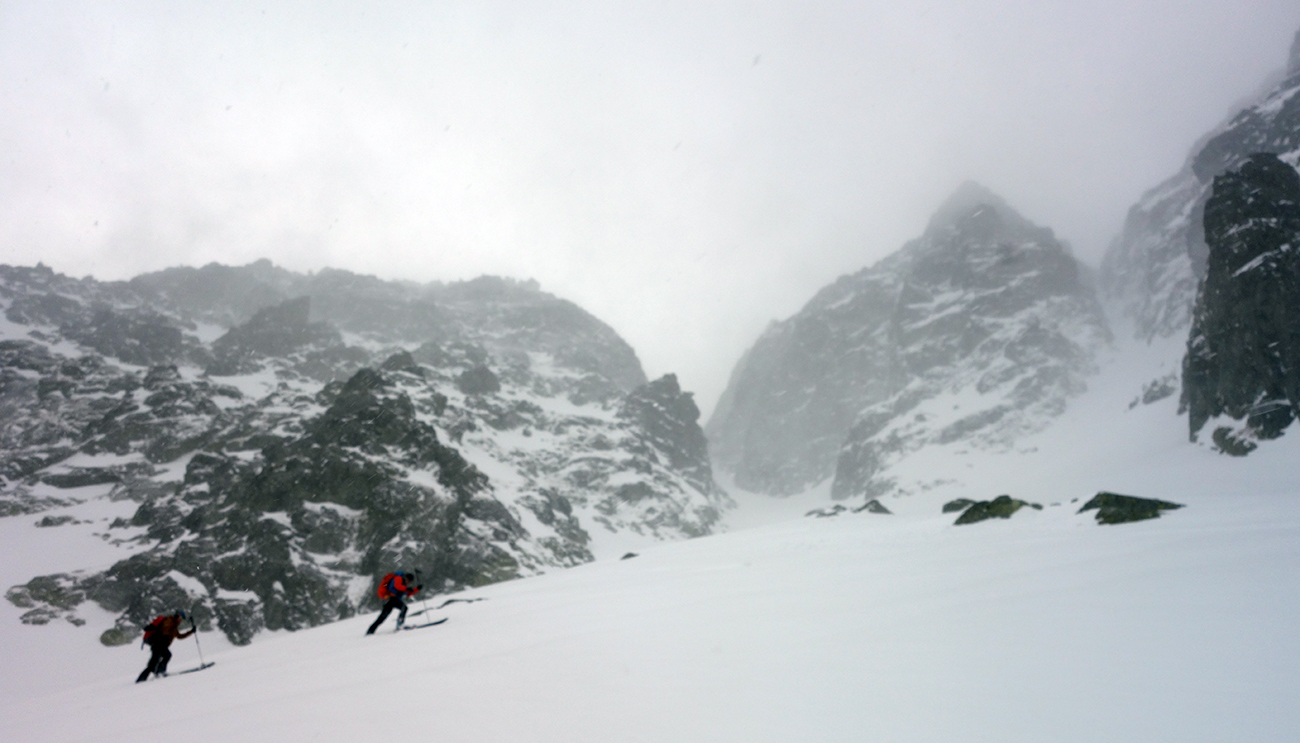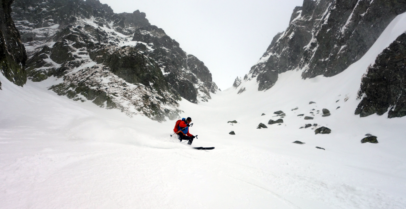 Jasnou voľbou na druhý výšľap sa stáva Hlinské sedlo. Pod vplyvom adrenalínu z parádnej jazdy prvýkrát a naposledy ťahám stopu, a aj to len do polovice žľabu. Meníme lyže za mačky a v horšiacom sa počasí prichádzame do Hlinského sedla. Pochopiteľne sa nezdržujeme a valíme dole. Sklon žľabu z Hlinského sedla je o niečo poctivejší, ale kvalita snehu je stále veľmi dobrá. Po chvíli sme na dne Satanej dolinky. Ja som tiež na dne, no stará garda je nekompromisná a diktuje šliapať do Satanovho žľabu. Lepšie, ako ich dve hodiny čakať pri pive, sa mi nakoniec zdá vyraziť spolu s nimi. Fúka, sneží a ja nevládzem. Robo však tvrdí, že sa vyčasí, čo sa mi veru nechce veriť. Akosi automaticky nahadzujem pásy a odkrajujem prvé metre úvodným širokým kužeľom. Postupne naberáme výšku a počasie sa na moje prekvapenie vylepšuje. Predpoveď a Robo neklamali. Zlepšenie počasia je vítanou motiváciou. Peťovi s Robom sa darí ťahať stopu prekvapivo vysoko. Nového snehu nie je málo, trochu upokojuje, že pred nami si už jazdu vychutnali dvaja skialpinisti. Vo vrchnej tretine žľabu, kde to už na lyžiach ďalej nejde, už som celkom na kašu a bágrovať sa žľabom po gule vynechávam. Tam, kde si staré pušky dajú lyže na batoh, ja zamieňam do zjazdového módu a ešte ich pri otrockom záverečnom výšľape pozorujem. Dochystám sa na zjazd, chalani mi zmiznú v esovitom žľabe a ja zapúšťam v zhutnenom prašane prvé oblúky. Zamierim ku skale mimo spádnice žľabu a čakám na parťákov. Už spoločne si vychutnávame rozširujúci sa kužeľ pod Satanom, stále vo výbornom snehu. Dojazd bez vyzutia plynule až k hotelu a nádherný deň v milovanej doline za nami.