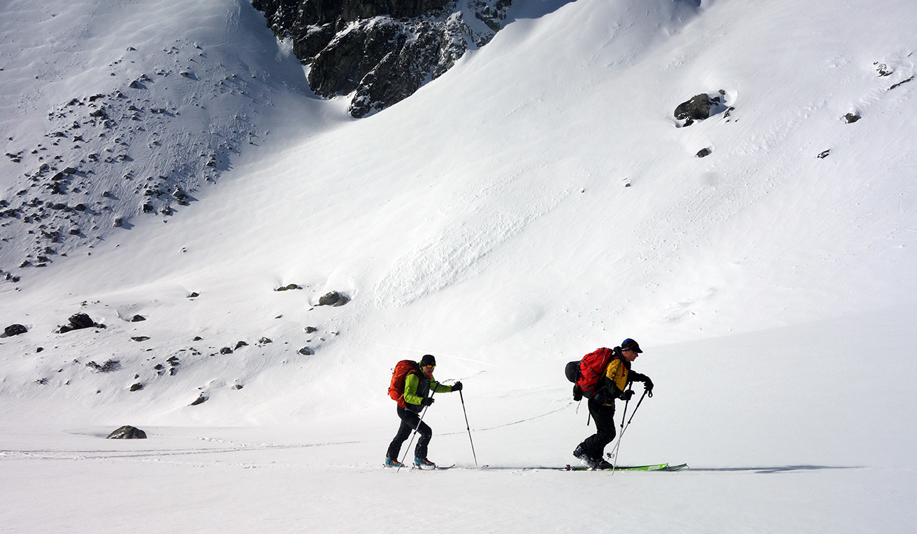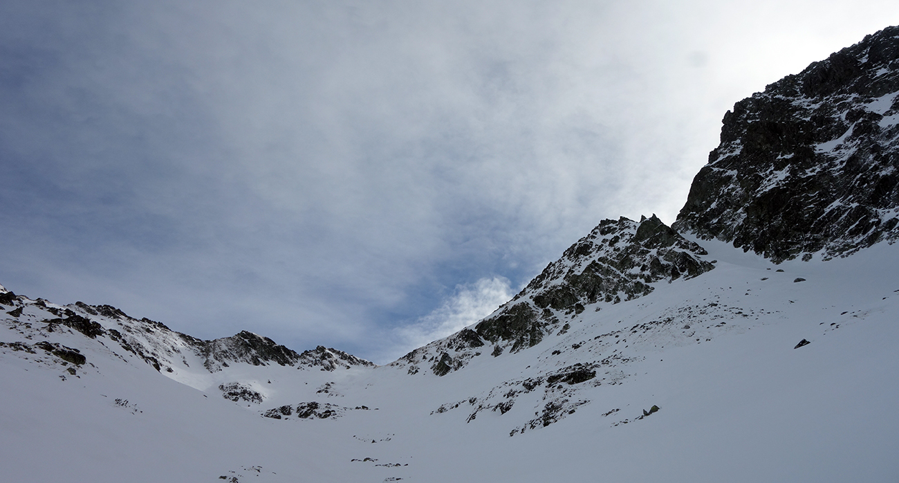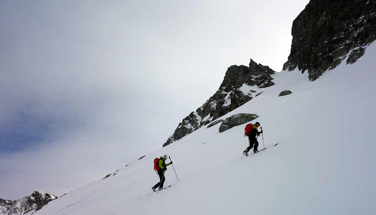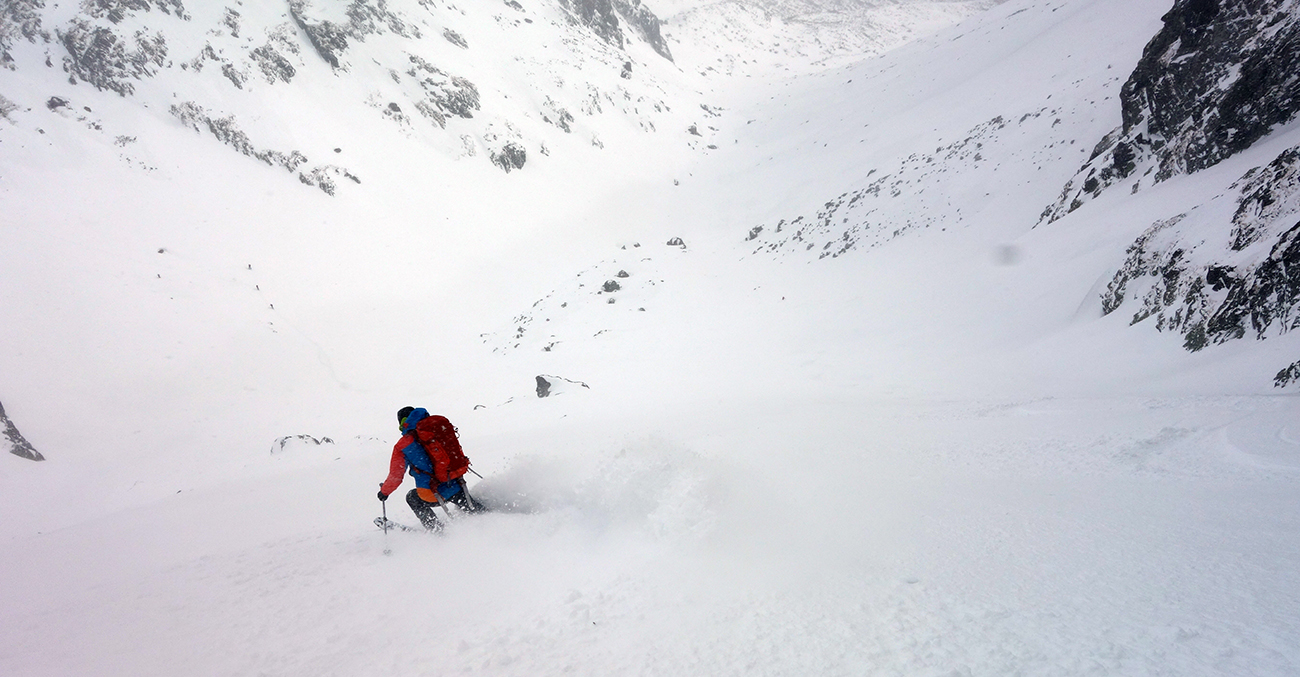 Jasnou voľbou na druhý výšľap sa stáva Hlinské sedlo. Pod vplyvom adrenalínu z parádnej jazdy prvýkrát a naposledy ťahám stopu, a aj to len do polovice žľabu. Meníme lyže za mačky a v horšiacom sa počasí prichádzame do Hlinského sedla. Pochopiteľne sa nezdržujeme a valíme dole. Sklon žľabu z Hlinského sedla je o niečo poctivejší, ale kvalita snehu je stále veľmi dobrá. Po chvíli sme na dne Satanej dolinky. Ja som tiež na dne, no stará garda je nekompromisná a diktuje šliapať do Satanovho žľabu. Lepšie, ako ich dve hodiny čakať pri pive, sa mi nakoniec zdá vyraziť spolu s nimi. Fúka, sneží a ja nevládzem. Robo však tvrdí, že sa vyčasí, čo sa mi veru nechce veriť. Akosi automaticky nahadzujem pásy a odkrajujem prvé metre úvodným širokým kužeľom. Postupne naberáme výšku a počasie sa na moje prekvapenie vylepšuje. Predpoveď a Robo neklamali. Zlepšenie počasia je vítanou motiváciou. Peťovi s Robom sa darí ťahať stopu prekvapivo vysoko. Nového snehu nie je málo, trochu upokojuje, že pred nami si už jazdu vychutnali dvaja skialpinisti. Vo vrchnej tretine žľabu, kde to už na lyžiach ďalej nejde, už som celkom na kašu a bágrovať sa žľabom po gule vynechávam. Tam, kde si staré pušky dajú lyže na batoh, ja zamieňam do zjazdového módu a ešte ich pri otrockom záverečnom výšľape pozorujem. Dochystám sa na zjazd, chalani mi zmiznú v esovitom žľabe a ja zapúšťam v zhutnenom prašane prvé oblúky. Zamierim ku skale mimo spádnice žľabu a čakám na parťákov. Už spoločne si vychutnávame rozširujúci sa kužeľ pod Satanom, stále vo výbornom snehu. Dojazd bez vyzutia plynule až k hotelu a nádherný deň v milovanej doline za nami.