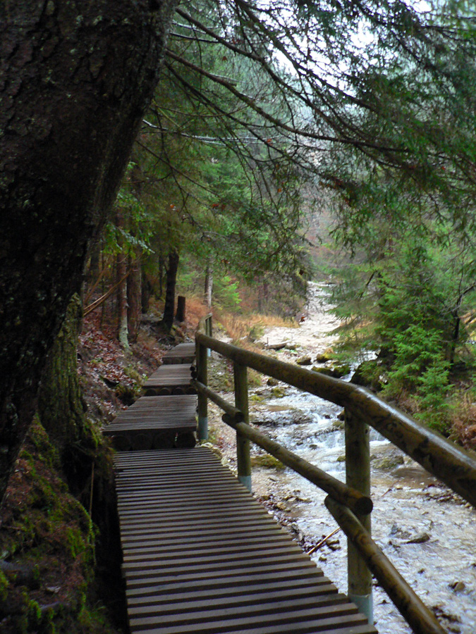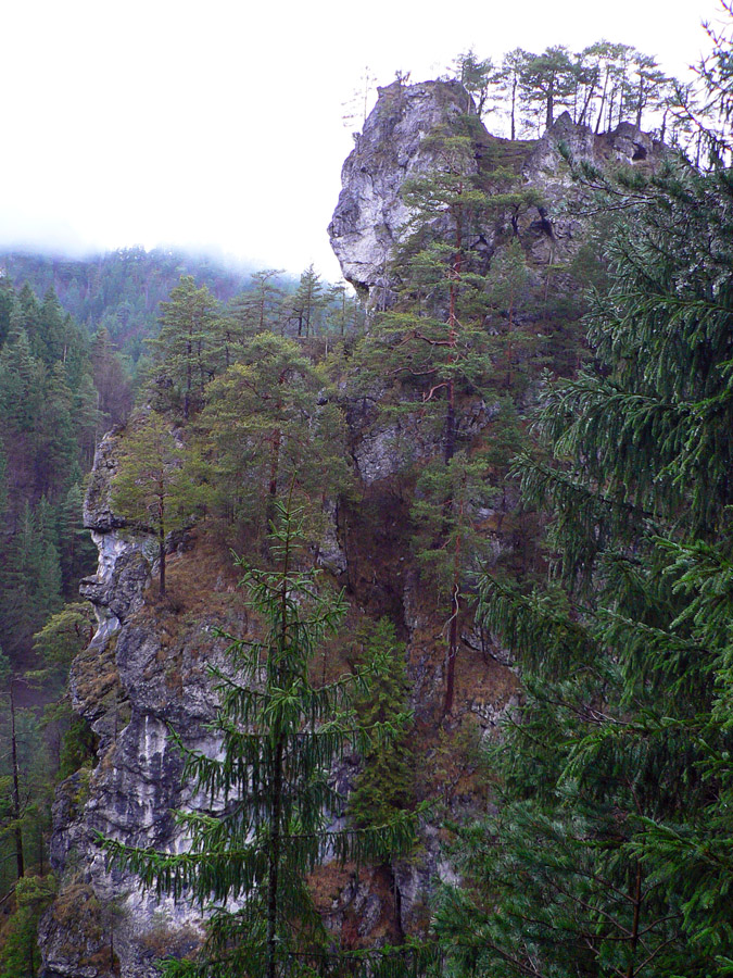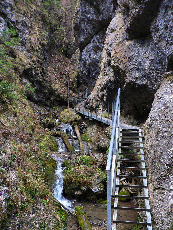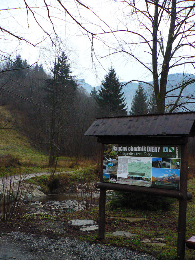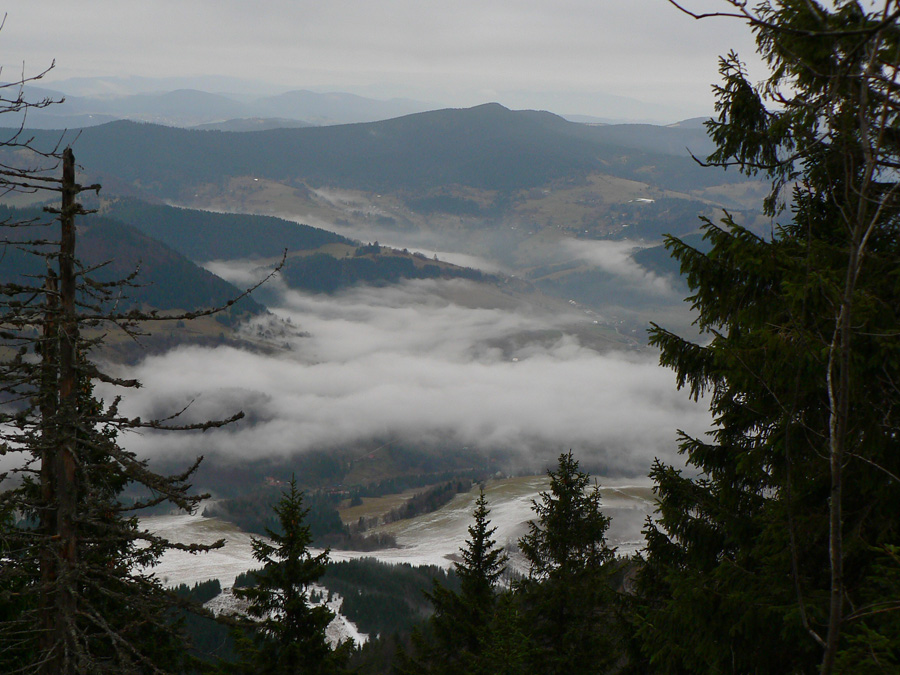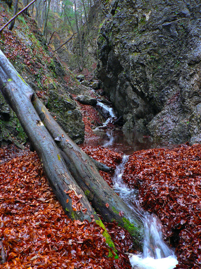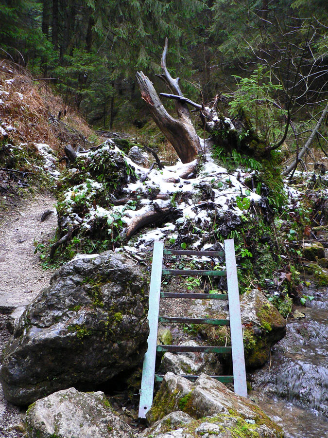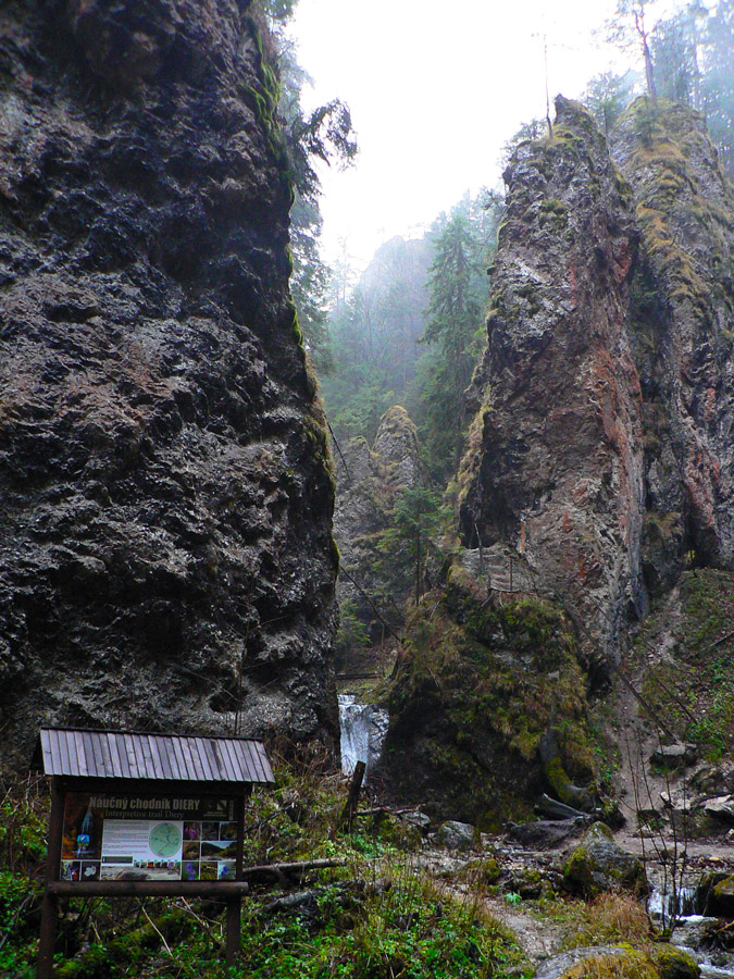 Počasie na mikulášsku sobotu vyšlo takmer ideálne hnusné: s občasným dažďom a hrebeňmi hôr v mrakoch, so zdrapmi hmiel v dolinách a s teplotou málo nad nulou. Aspoň že nefúkalo. Ale v tiesňavách pod Rozsutcom je pekne, aj keď je škaredo :-) Navyše v takomto počasí tam človek nestretne ani nohu, čo je vzácna príležitosť vychutnať si prírodu bez uhýbania, posúvania v rade - a najmä v tichu. A pre niekoho aj príležitosť zaexperimentovať si v pokoji so samospúšťou a manuálnym nastavením expozície pri fotení. Dosť užitočné pri slabom svetle, aké v „Dierach“ väčšinou panuje - a v decembrovom šere zvlášť :-) Takže som začal z Bieleho potoka od hotela, s plánom užiť si a presnoriť všetky tiesňavy. Na začiatok som prešiel po modrej Dolnými dierami na Podžiar a zišiel som nazad, ale už len k rázcestiu Ostrvné. To bola dobrá rozcvička s malým stúpaním, atraktívnymi úzkymi kaňonmi a keď tam nikoho niet, nie je problém prejsť to v oboch smeroch. V lete sú práve tu najväčšie „zápchy“, lebo ľudia chodia húfne z Bieleho potoka aj z opačnej strany, zo Štefanovej.