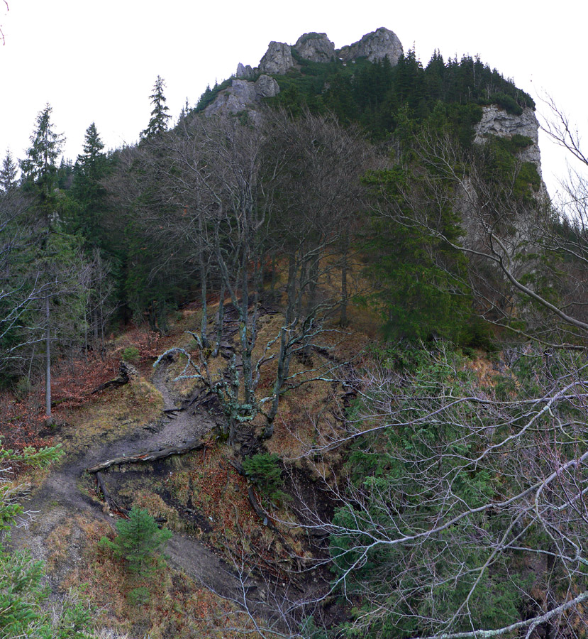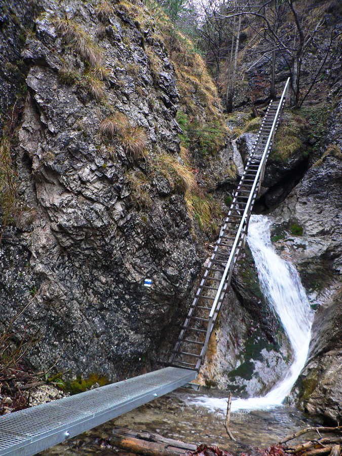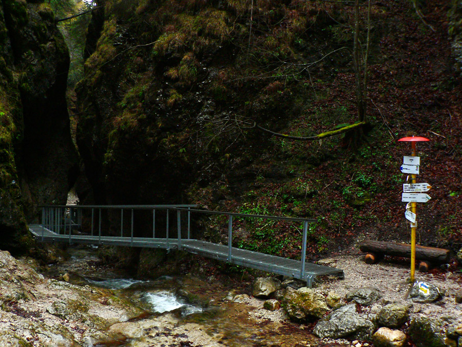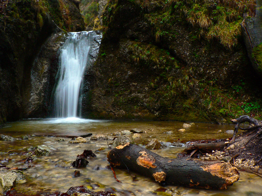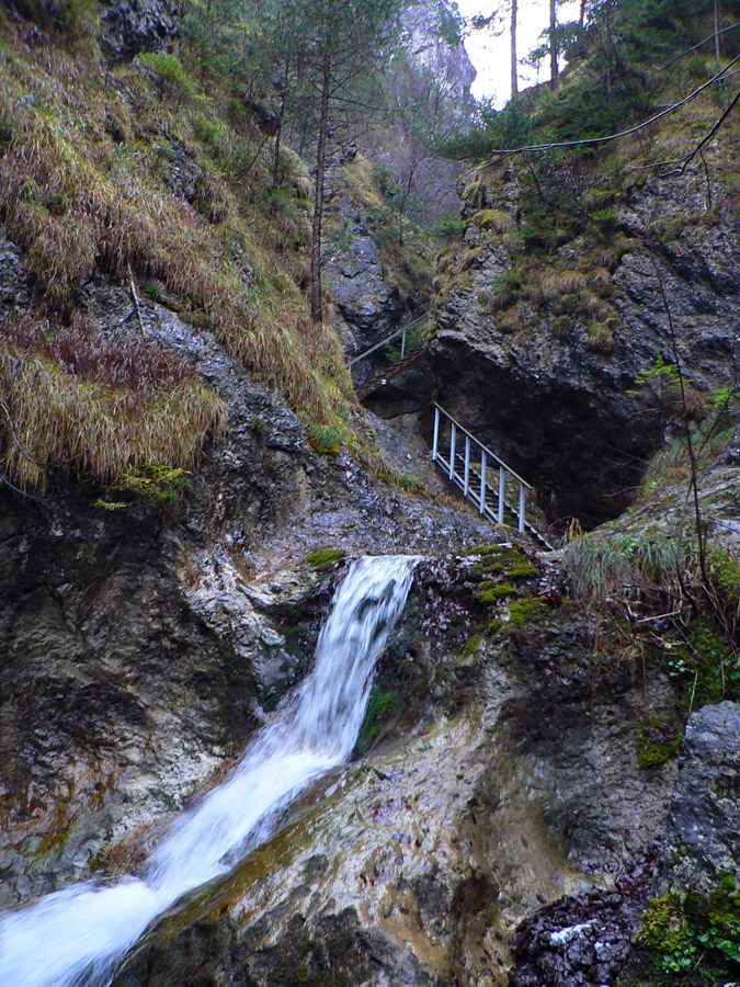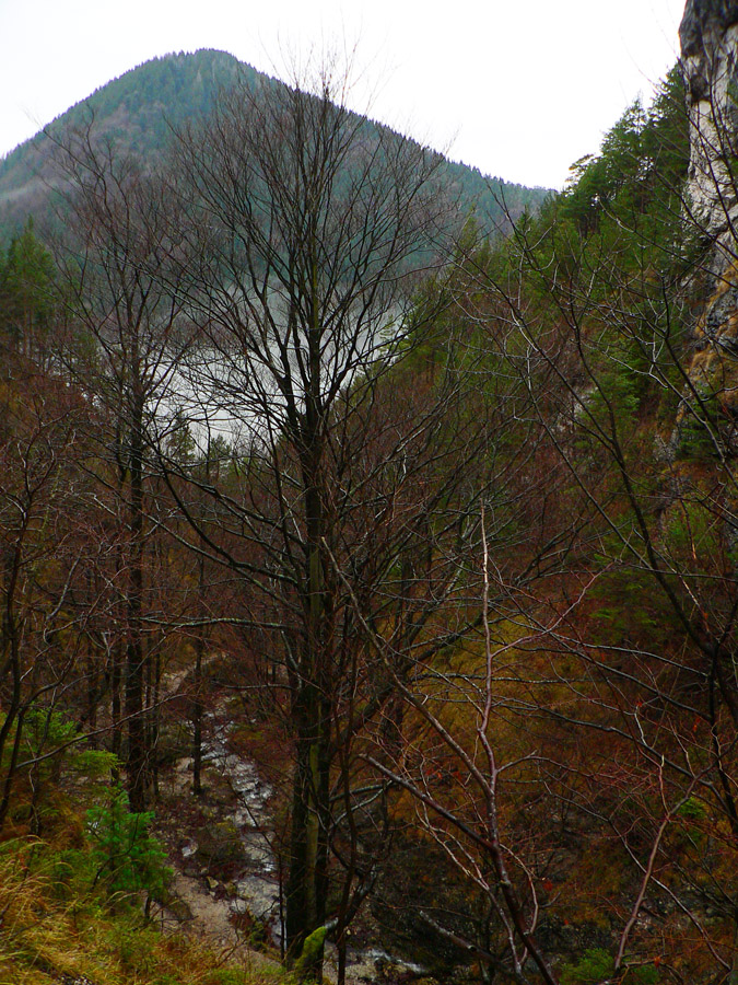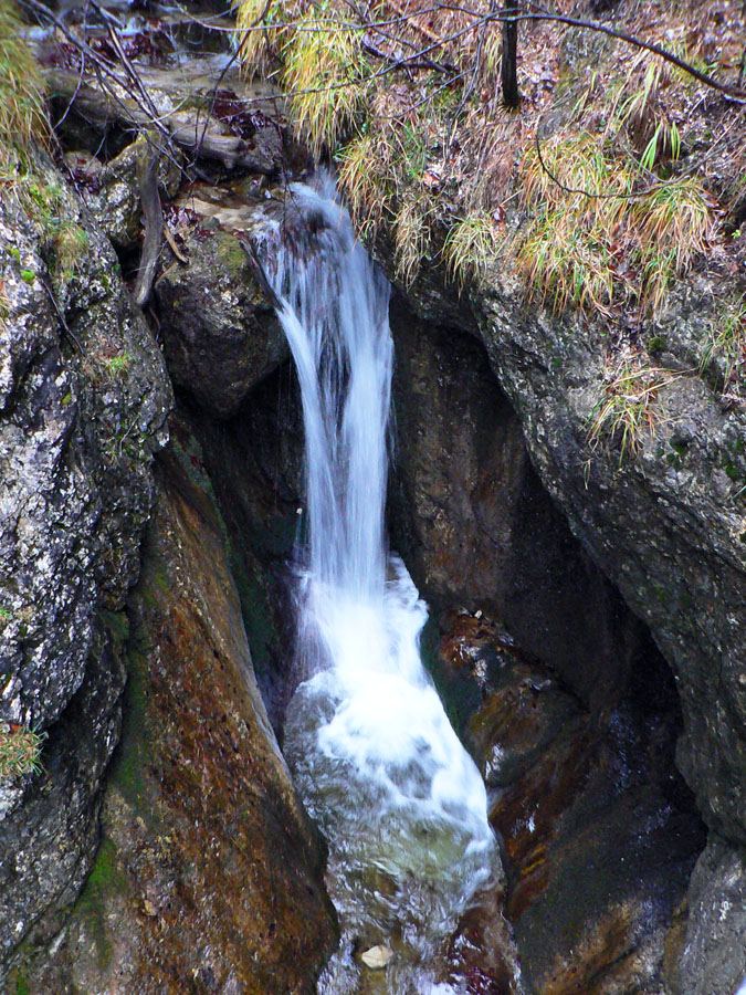 Počasie na mikulášsku sobotu vyšlo takmer ideálne hnusné: s občasným dažďom a hrebeňmi hôr v mrakoch, so zdrapmi hmiel v dolinách a s teplotou málo nad nulou. Aspoň že nefúkalo. Ale v tiesňavách pod Rozsutcom je pekne, aj keď je škaredo :-) Navyše v takomto počasí tam človek nestretne ani nohu, čo je vzácna príležitosť vychutnať si prírodu bez uhýbania, posúvania v rade - a najmä v tichu. A pre niekoho aj príležitosť zaexperimentovať si v pokoji so samospúšťou a manuálnym nastavením expozície pri fotení. Dosť užitočné pri slabom svetle, aké v „Dierach“ väčšinou panuje - a v decembrovom šere zvlášť :-) Takže som začal z Bieleho potoka od hotela, s plánom užiť si a presnoriť všetky tiesňavy. Na začiatok som prešiel po modrej Dolnými dierami na Podžiar a zišiel som nazad, ale už len k rázcestiu Ostrvné. To bola dobrá rozcvička s malým stúpaním, atraktívnymi úzkymi kaňonmi a keď tam nikoho niet, nie je problém prejsť to v oboch smeroch. V lete sú práve tu najväčšie „zápchy“, lebo ľudia chodia húfne z Bieleho potoka aj z opačnej strany, zo Štefanovej.