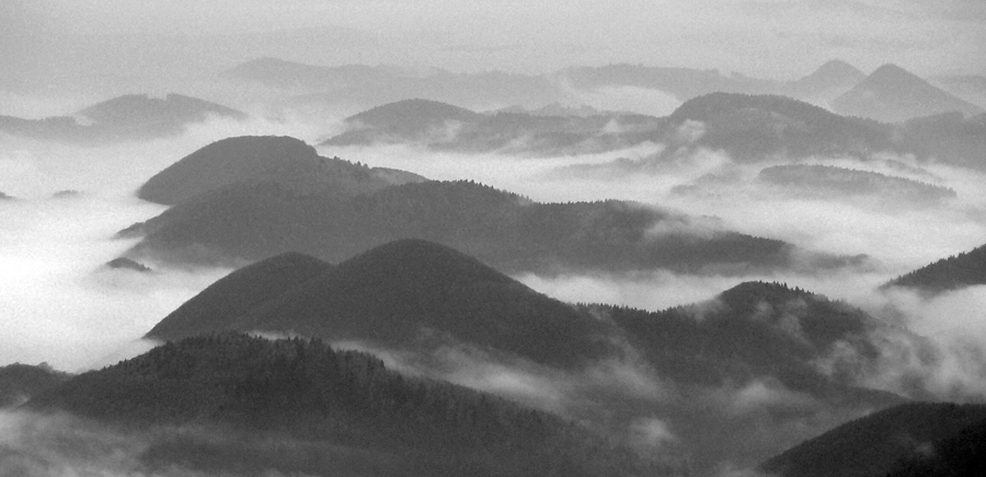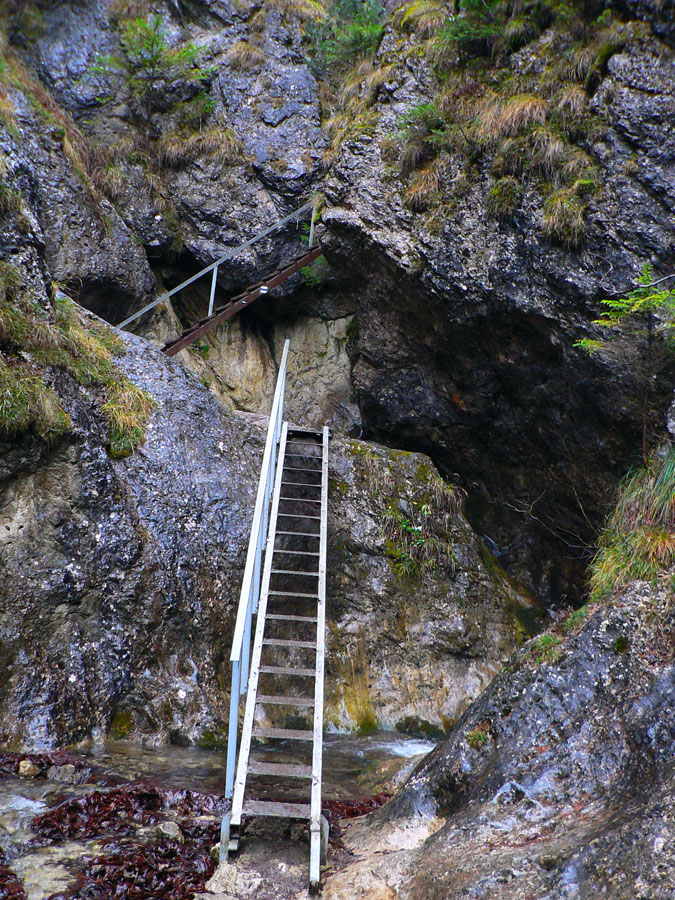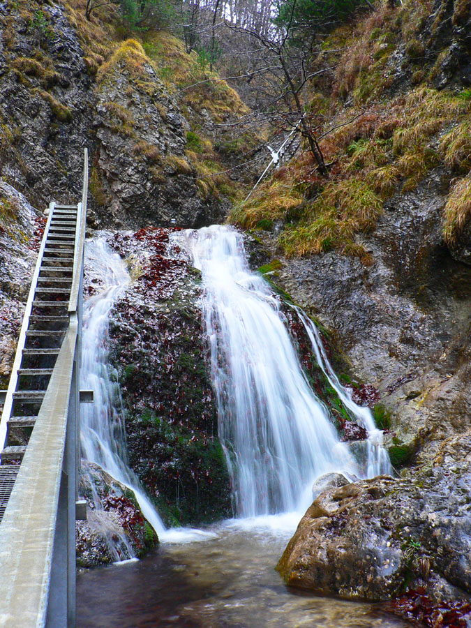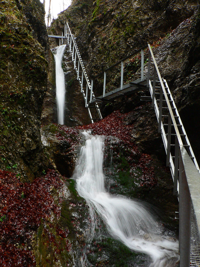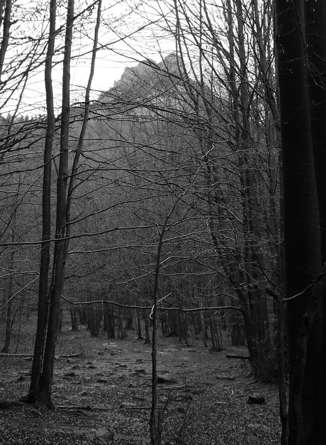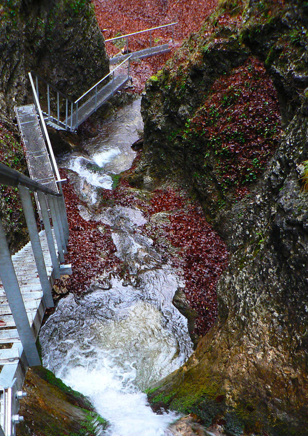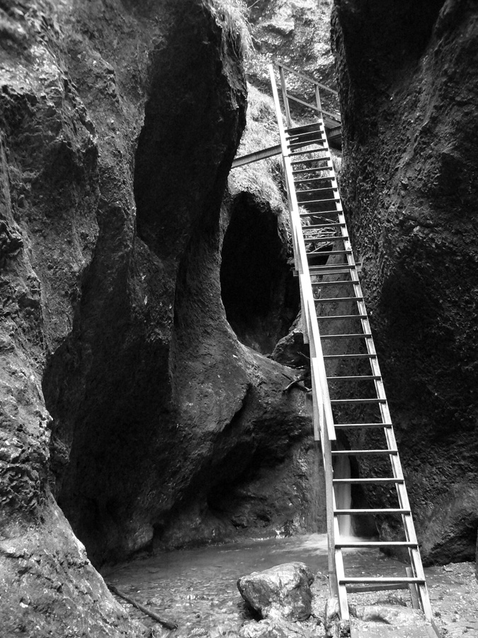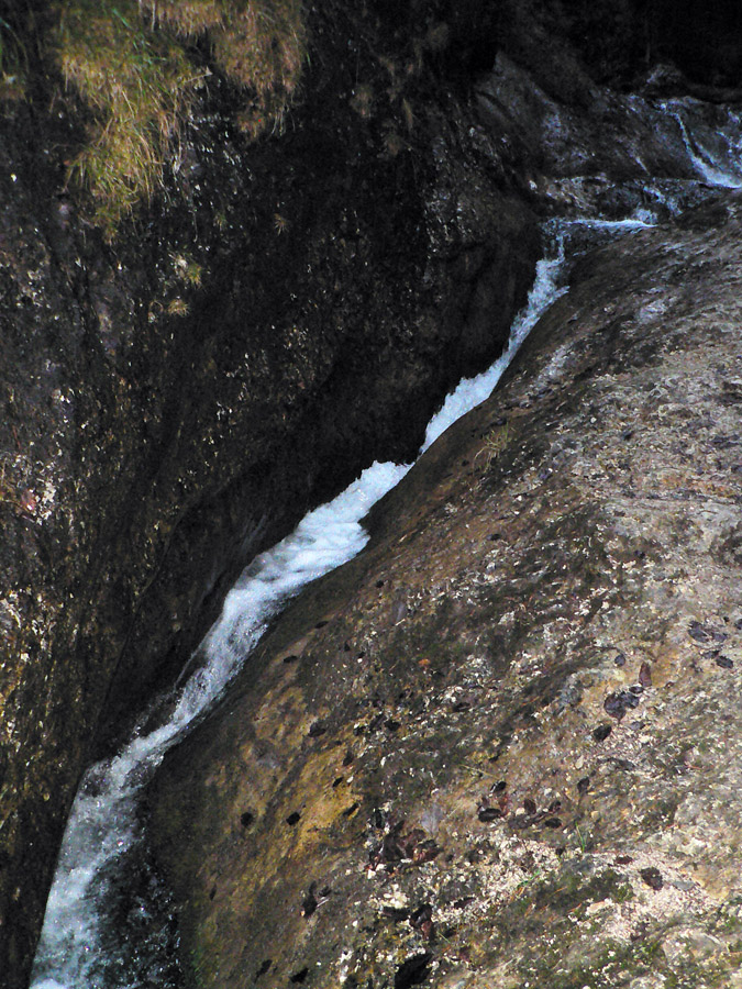 Počasie na mikulášsku sobotu vyšlo takmer ideálne hnusné: s občasným dažďom a hrebeňmi hôr v mrakoch, so zdrapmi hmiel v dolinách a s teplotou málo nad nulou. Aspoň že nefúkalo. Ale v tiesňavách pod Rozsutcom je pekne, aj keď je škaredo :-) Navyše v takomto počasí tam človek nestretne ani nohu, čo je vzácna príležitosť vychutnať si prírodu bez uhýbania, posúvania v rade - a najmä v tichu. A pre niekoho aj príležitosť zaexperimentovať si v pokoji so samospúšťou a manuálnym nastavením expozície pri fotení. Dosť užitočné pri slabom svetle, aké v „Dierach“ väčšinou panuje - a v decembrovom šere zvlášť :-) Takže som začal z Bieleho potoka od hotela, s plánom užiť si a presnoriť všetky tiesňavy. Na začiatok som prešiel po modrej Dolnými dierami na Podžiar a zišiel som nazad, ale už len k rázcestiu Ostrvné. To bola dobrá rozcvička s malým stúpaním, atraktívnymi úzkymi kaňonmi a keď tam nikoho niet, nie je problém prejsť to v oboch smeroch. V lete sú práve tu najväčšie „zápchy“, lebo ľudia chodia húfne z Bieleho potoka aj z opačnej strany, zo Štefanovej.