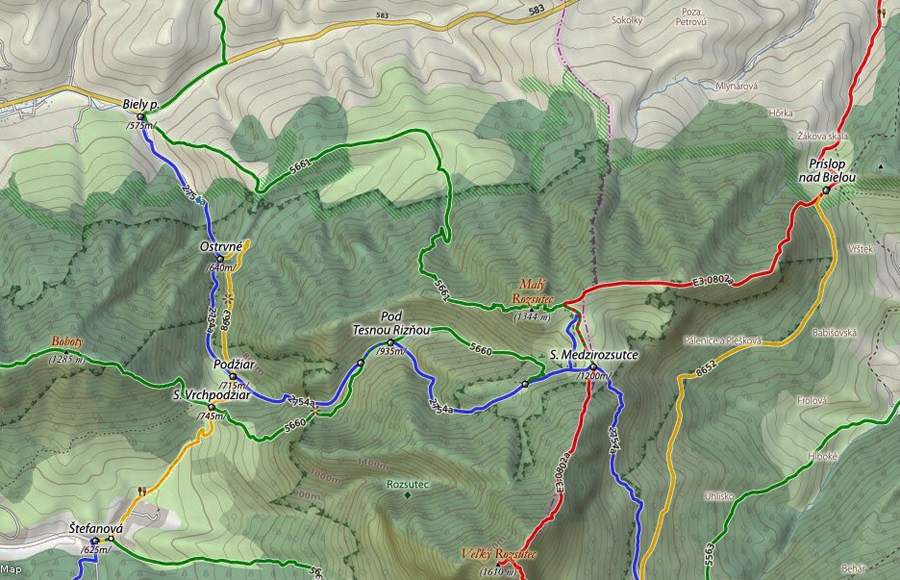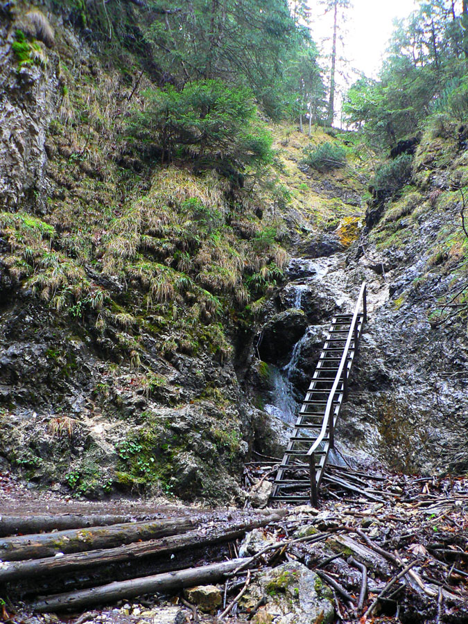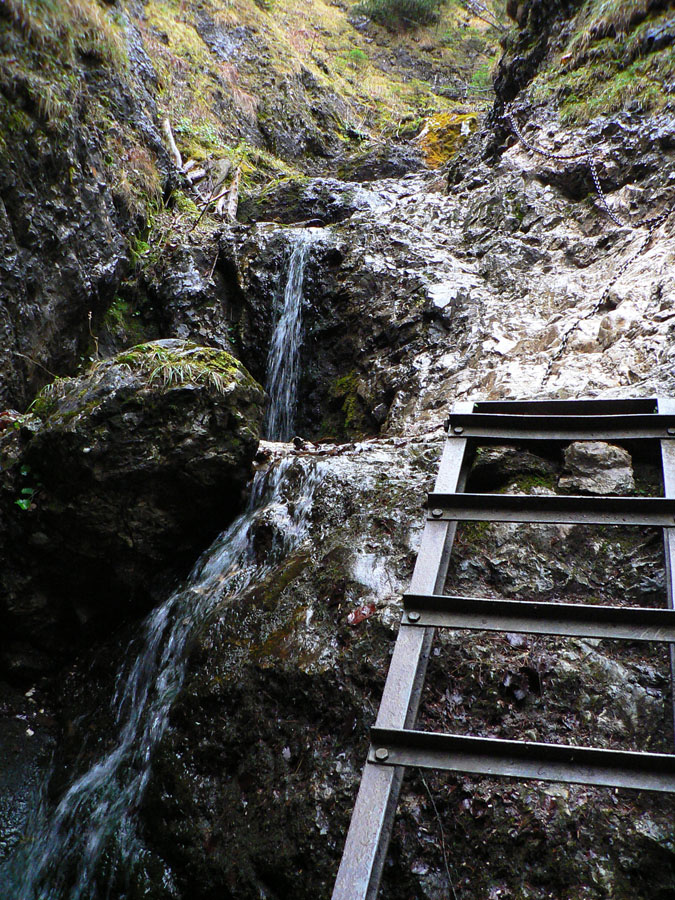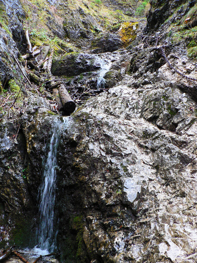 Rovnako aj smerom dole, po zelenej. Na to som sa zvlášť tešil, lebo tade som ešte nešiel. Takže som si užil najskôr pár stoviek metrov „zlaňovania“ po reťaziach (sutina alebo klzký vápenec ako smerom hore z druhej strany) a následný strmý zostup lesom do osady Podrozsutec. Potom už len posledný úsek zablatenými lúkami a lesmi, nazad k parkovisku pri hoteli, odkiaľ som ráno vyrazil.