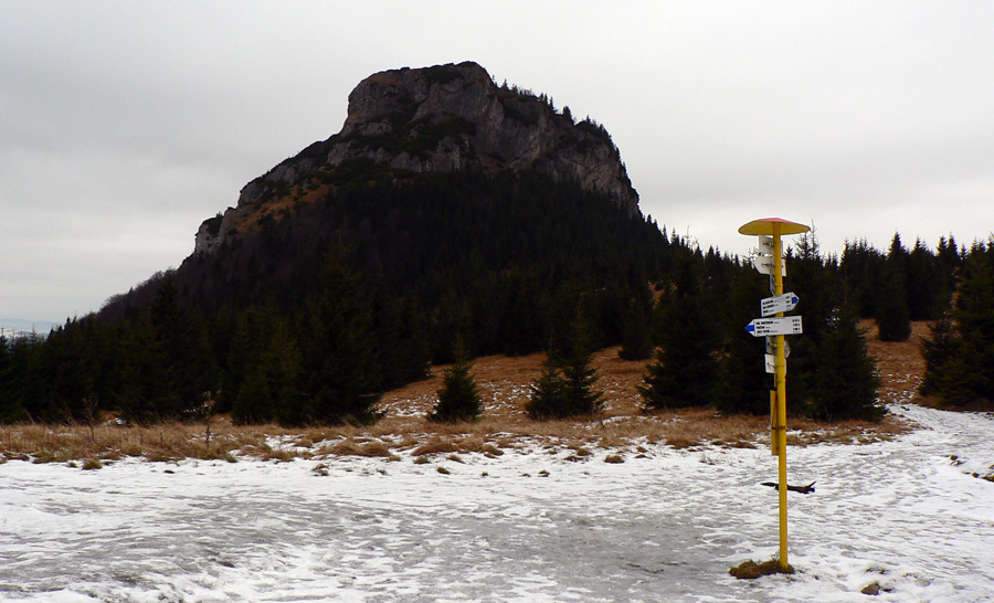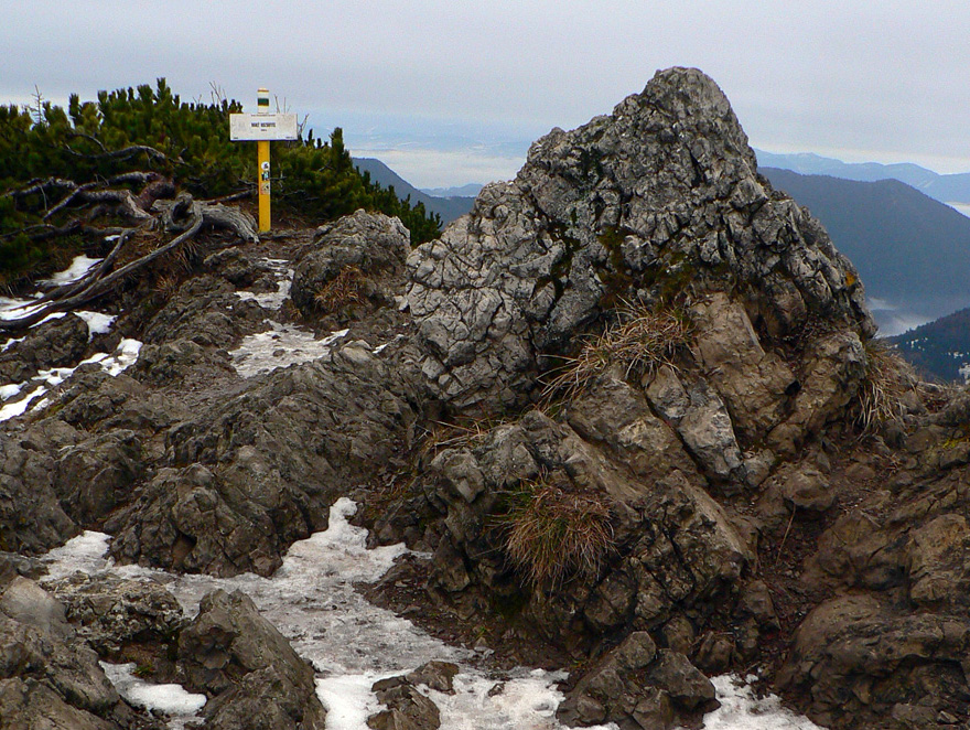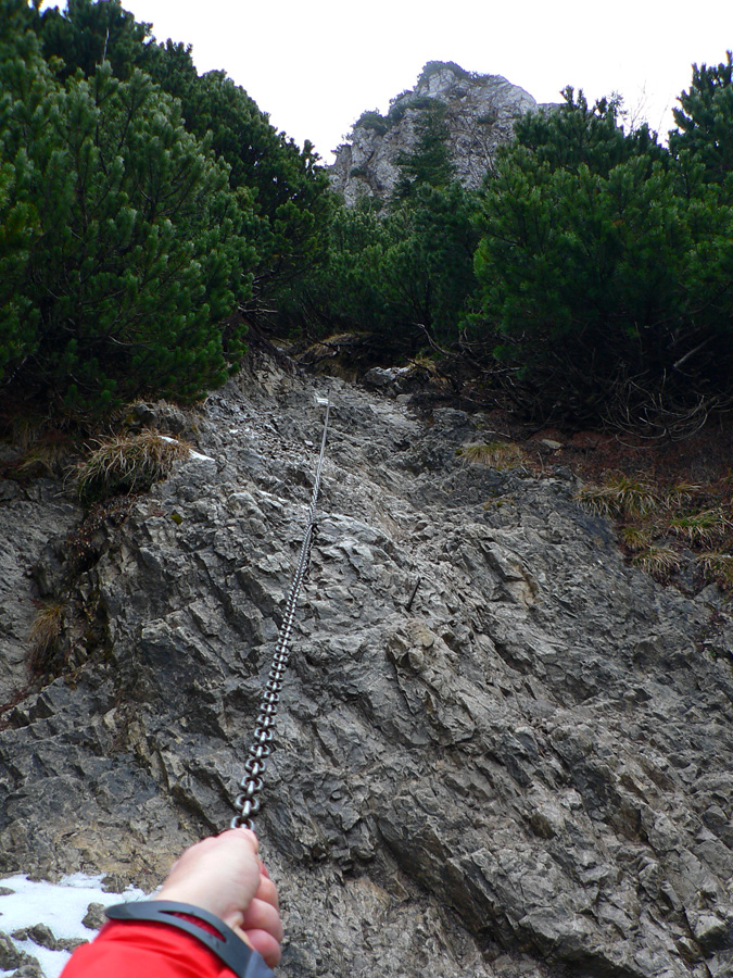 Potom ma už chodník „vypľul“ v sedle medzi Rozsutcami. Kým Veľký Rozsutec bol zahalený v mraku, malý pyšne dominoval okoliu. Presne to som potreboval. Krátky presun po lúkach a o chvíľu už som „feratoval“ po reťaziach na vrchol. Výhľady samozrejme nič moc, svetlo biedne, krajina do šeda, ale mraky dostatočne vysoko a to bralo a cesta naň stojí za to v každom počasí.