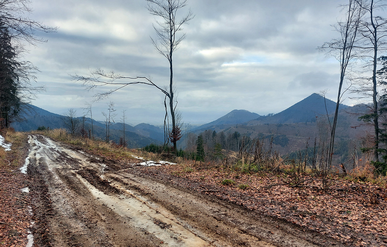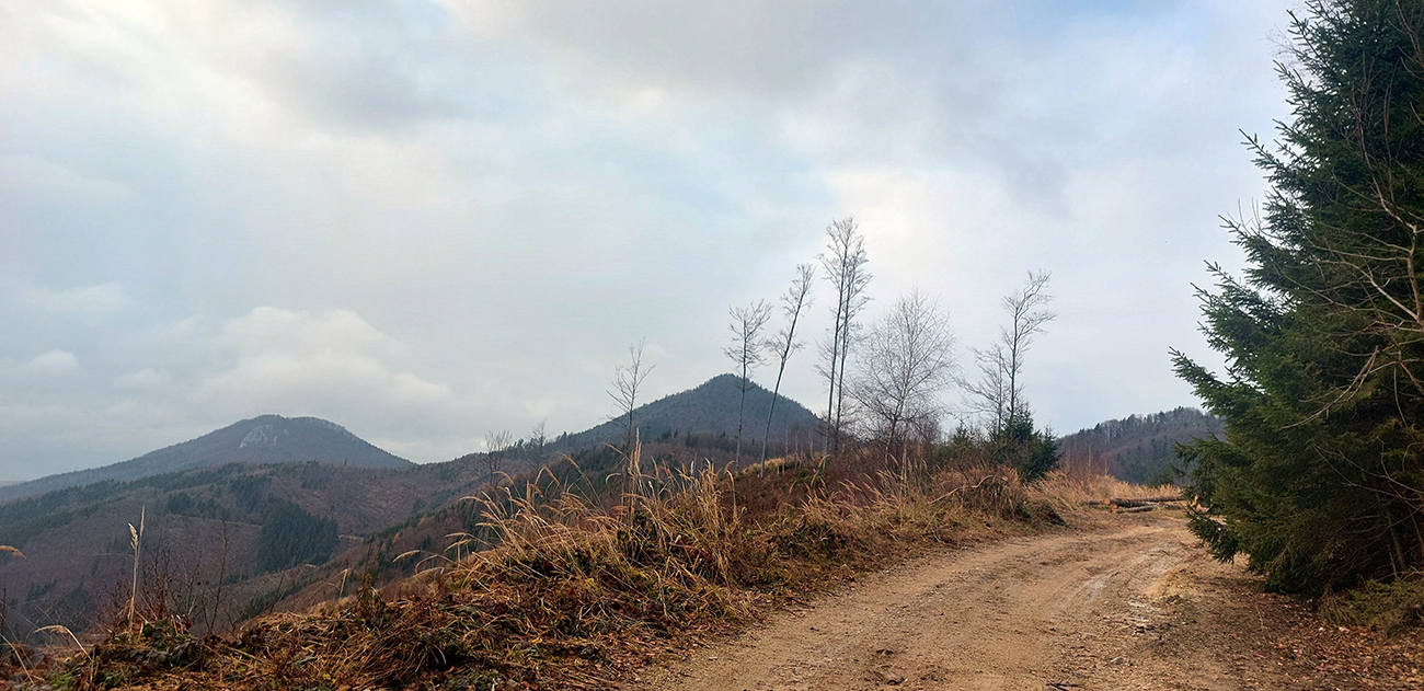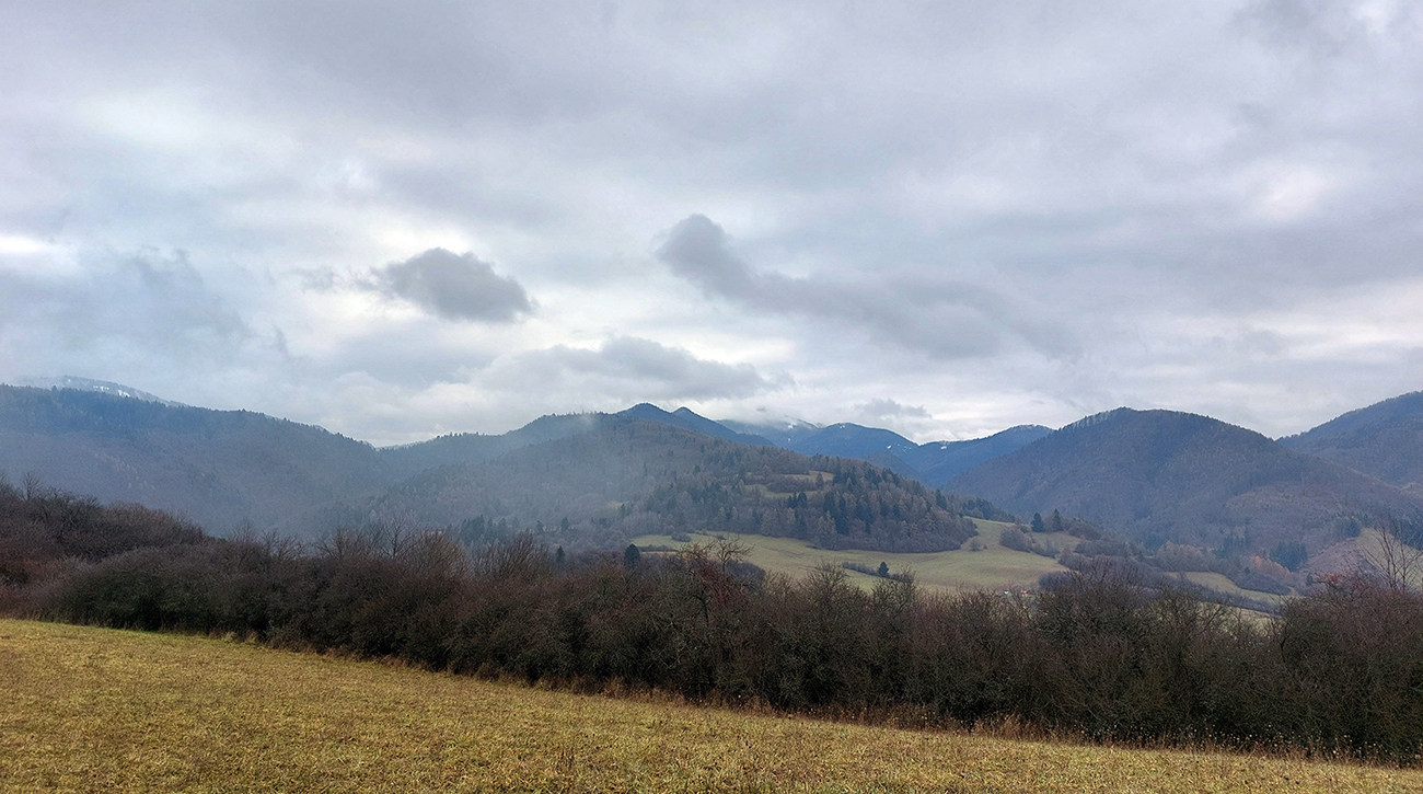 Na úvod som pribalil Maja, ktorý dostal priepustku len doobeda a na môj údiv tú peknú cestu na Bieličie od Sučian nepoznal. Čo je to za domorodca? Niet divu, že ma najprv vliekol cez nejaké kompostovisko, kde také blato, aké sme na začiatku ešte neakceptovali, tak davaj nazad a po lúkach. Cez Bieličie pohoda a výhľady len do sivoty. Potom poza salaš do ústia Konštianskej doliny blato ešte horšie, len už nevyhnuteľné. Tam nad Konským sme sa navzájom opustili.
