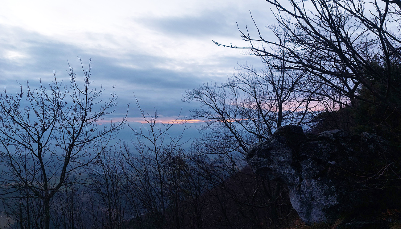 Zvážnica smerom pod Katovu skalu, vysypaná makadamom, to bol poriadny kontrast, našťastie pod vrcholom, v rezervácii, už zas pekne. Povinná zachádzka na výhľad, kade som sa to doteraz motal, ale najmä na druhú stranu, na západ, kde som si pri pohľade na červený pásik nad horizontom uvedomil, že sa ide stmievať. Sakra, poriadne som bol pomalý!