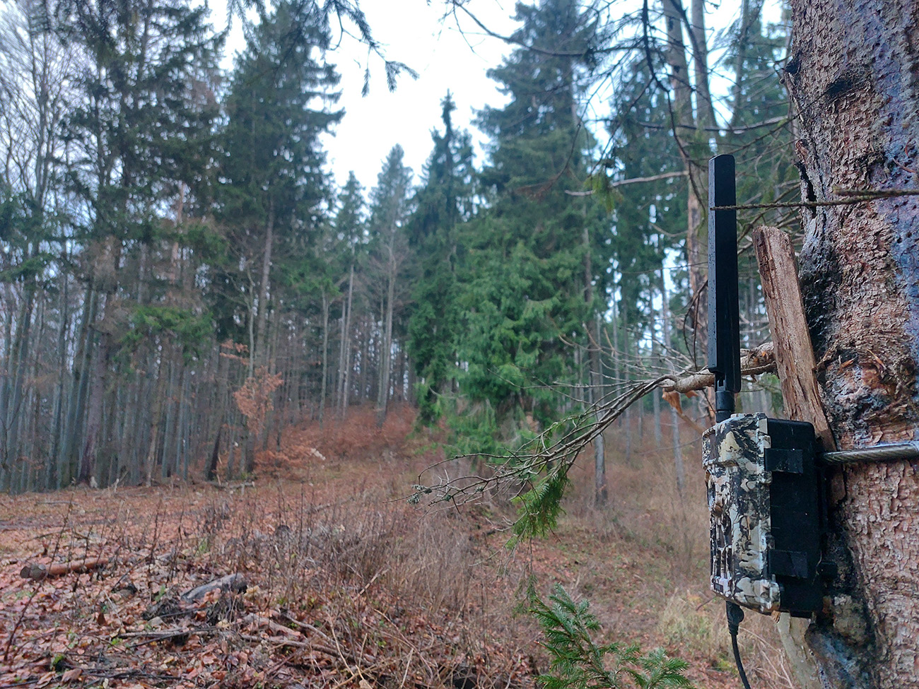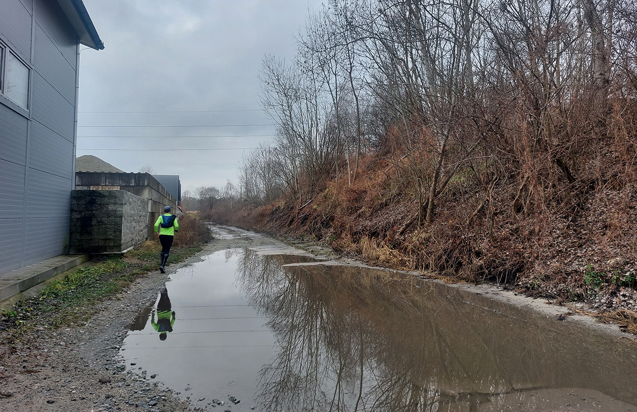 Tak zrýchlený presun dole kopcom k jazierkam Teplických serpentín, po neoficiálnych oranžových značkách, krížom cez rúbane, ale po relatívne jednoznačnom chodníku. Na vyhliadku ku krížu som už ani nešiel, stmievalo sa akosi moc rýchlo pod tou sivou dekou.