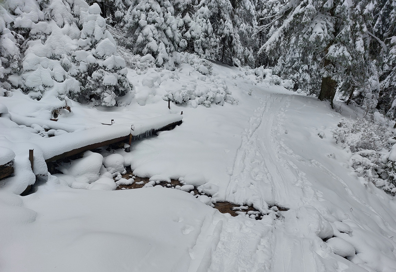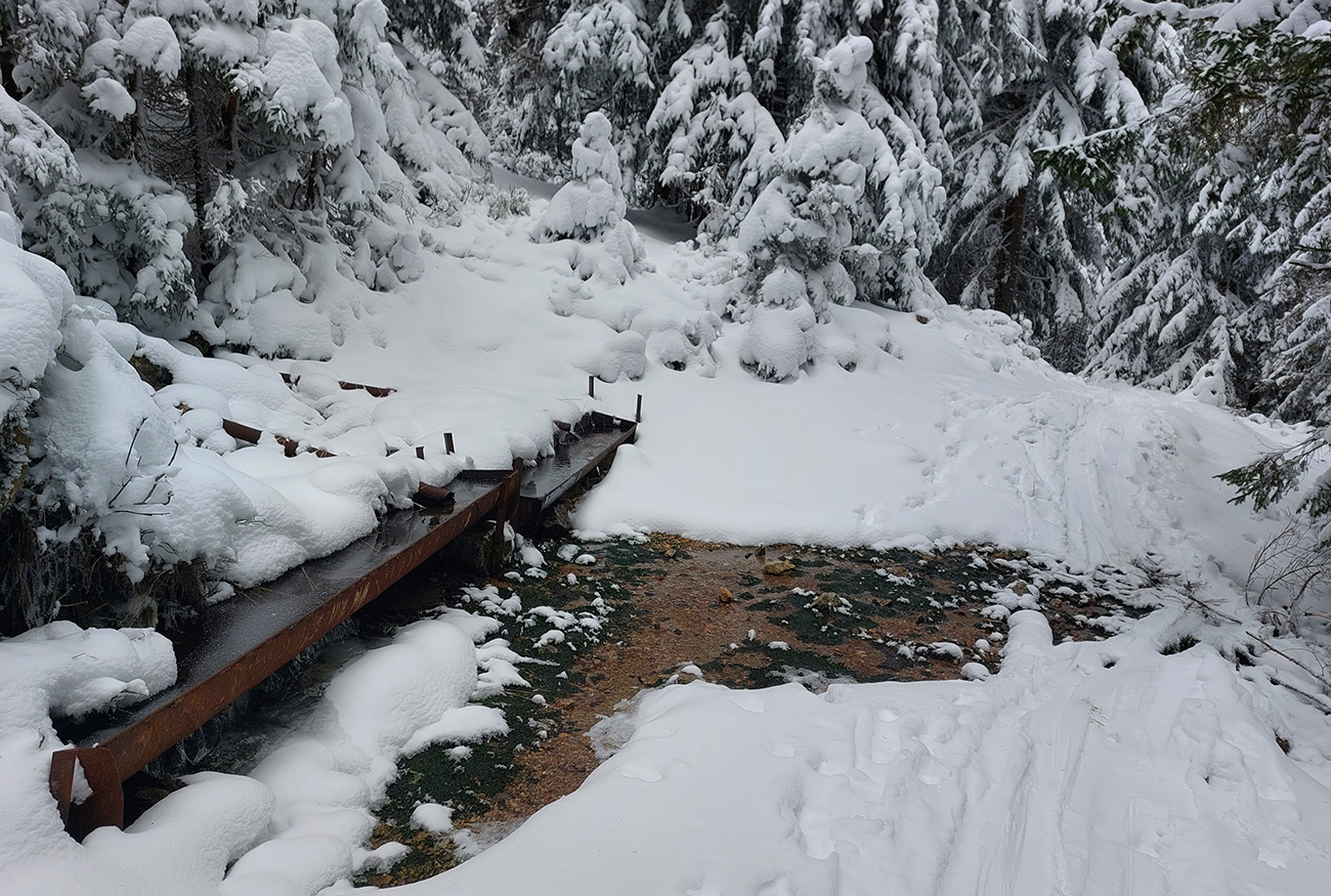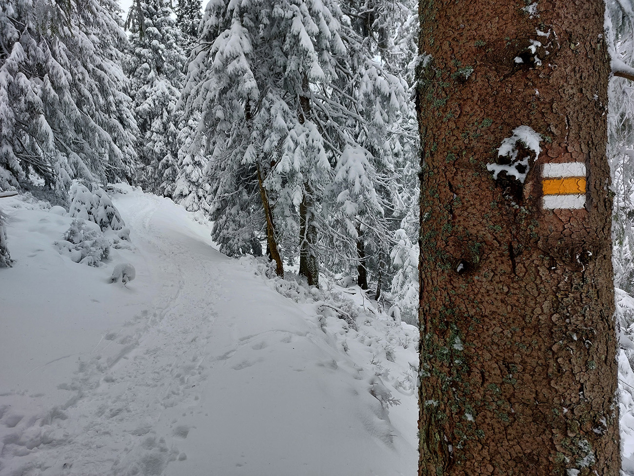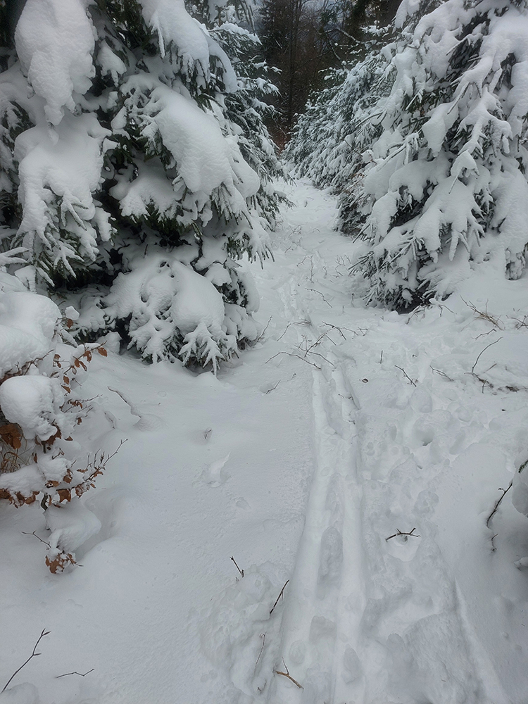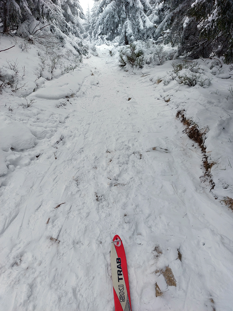 Cez lúky popri chalupách, lesom popri napájadlách a cez horný okraj Dlhej lúky až do sedla Prašivé všetko v pohode, ale na túto nadmorskú výšku ozaj žalostne málo snehu. Kľúčové sú napájadlá, ale dá sa cez ne opatrne prejsť „suchým pásom“.