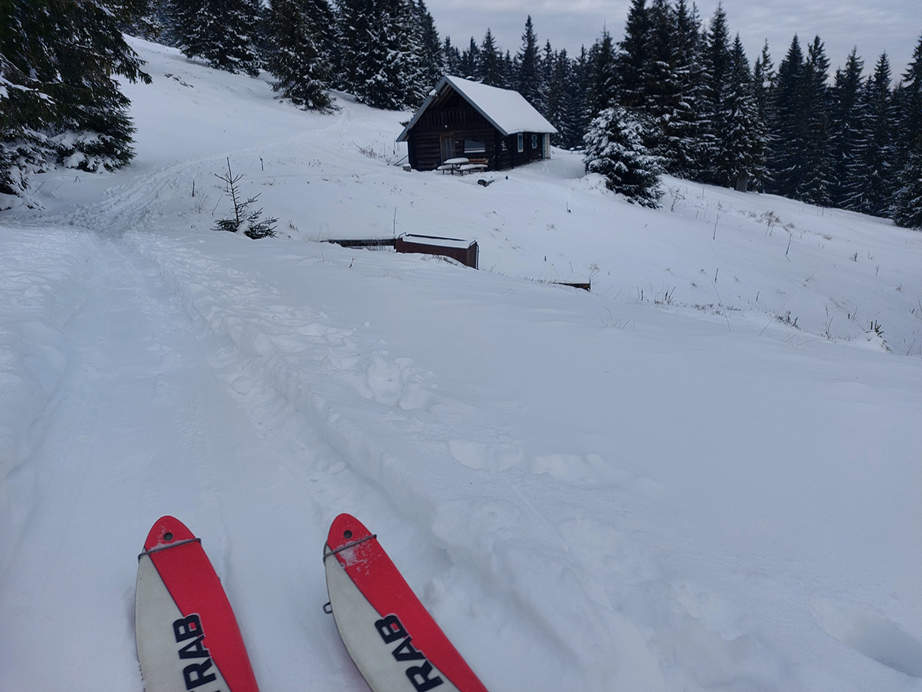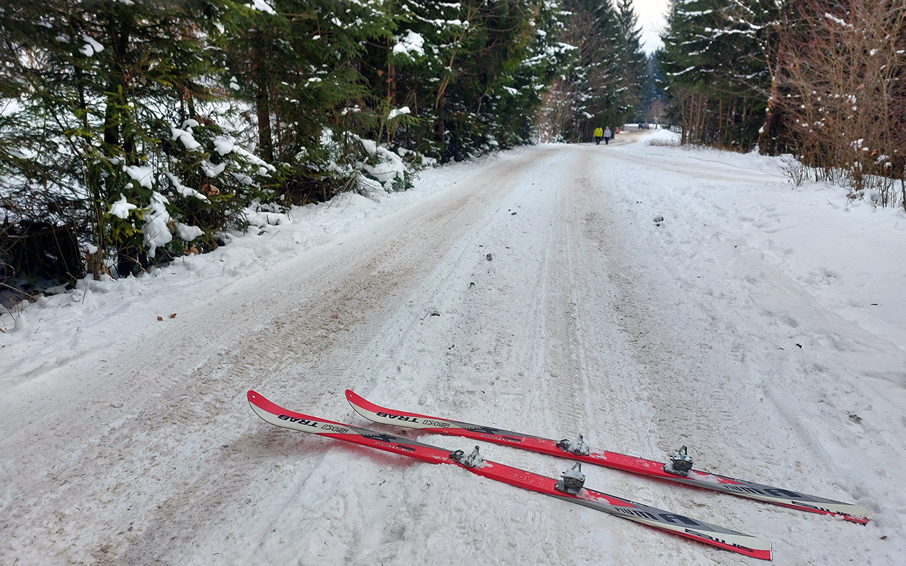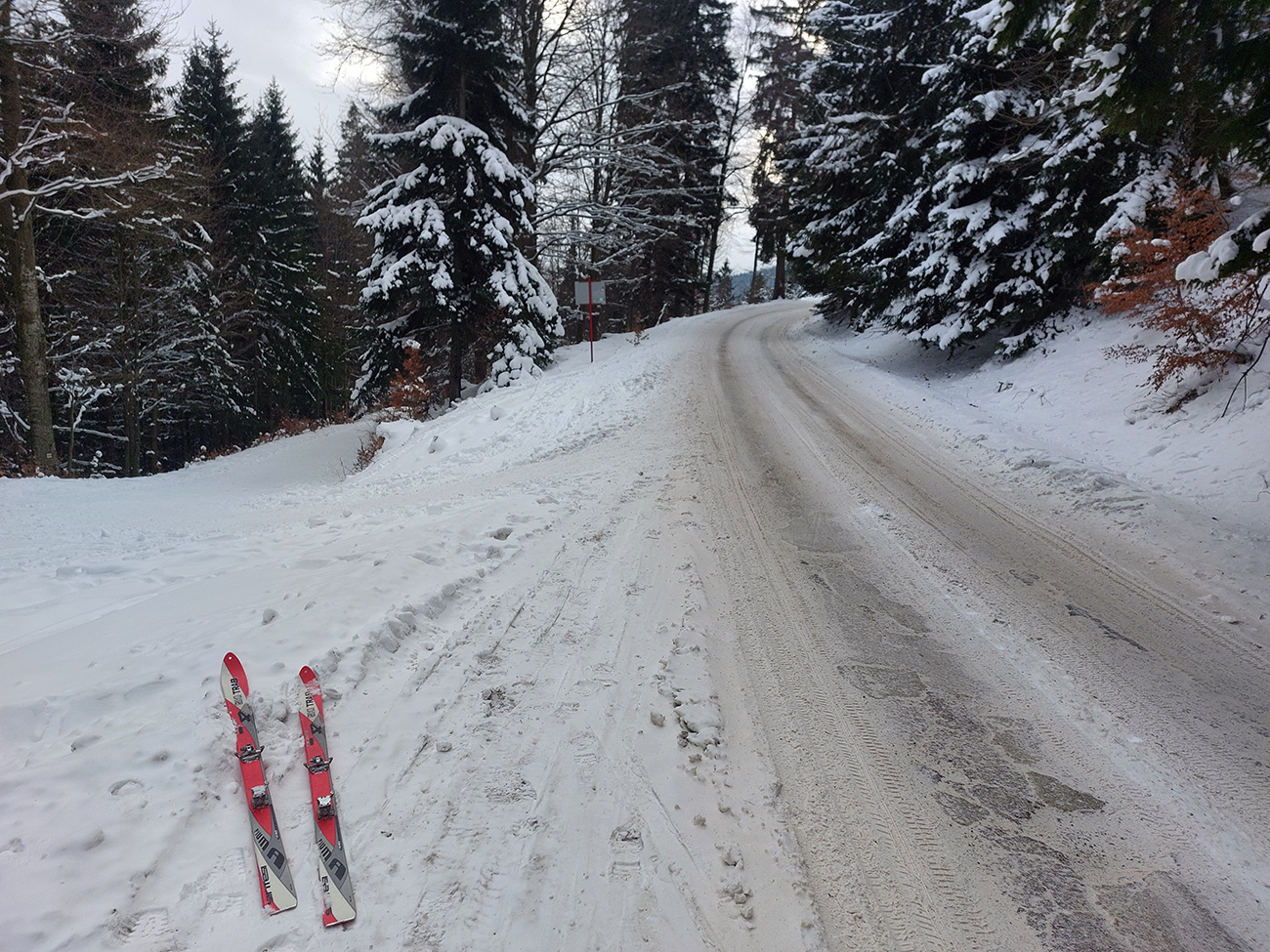 Tak už len dole – okolo chaty Javorina tiež cesta do šutrov vetrom vylízaná, no potom už výborná. A zjazdovka je istota. Od dolnej stanice sedačky som priesek na asfaltku zniesol, aj keď v jemnejších sklonoch by to šlo. Ale už boli lyže na batohu, pripravené odniesť sa až pod Kalužnú, na začiatok serpentín.