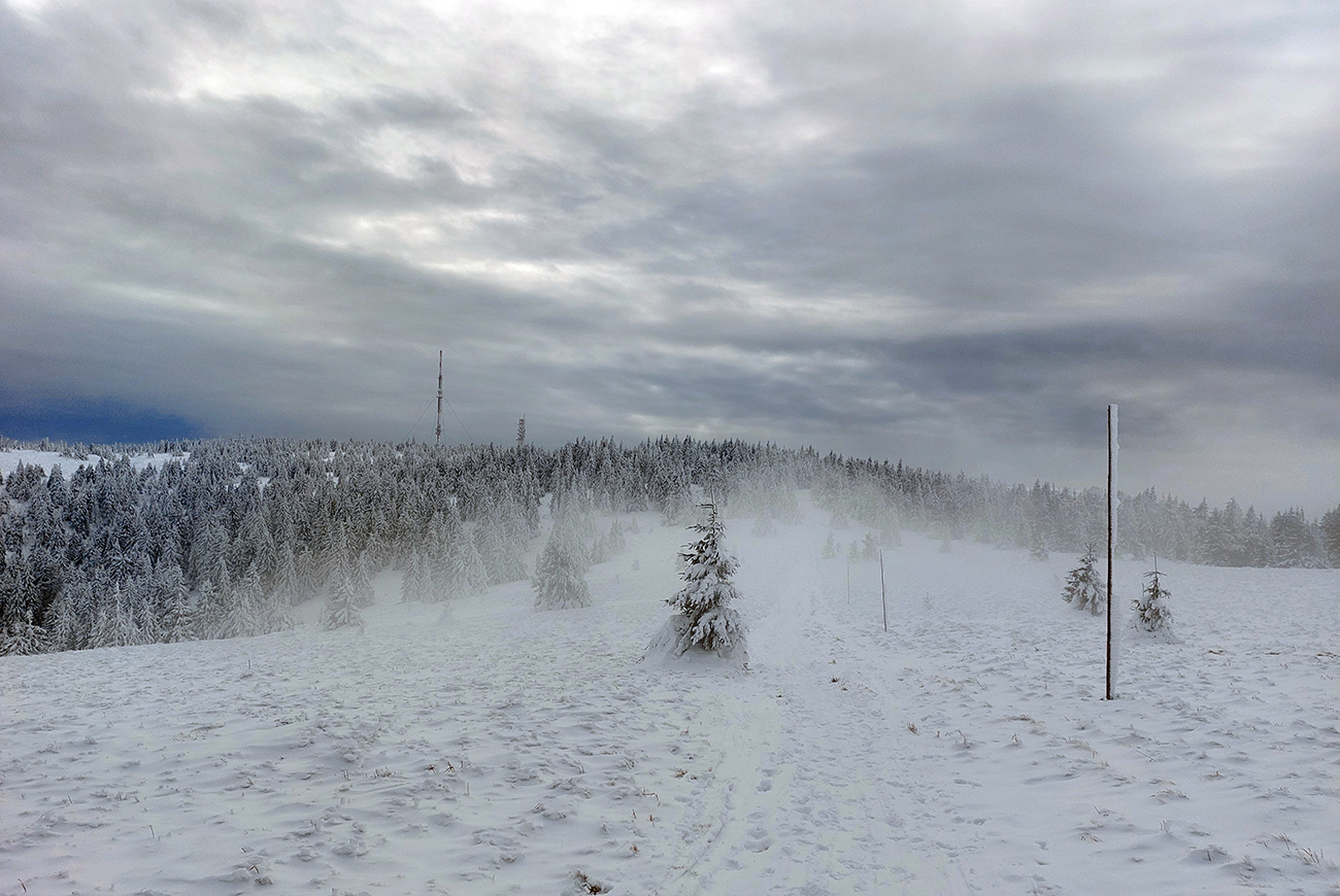 Ešte som odskočil k malému vysielaču na Veľkej lúke – záverečný válov v kosovke pekne vysnežený, aj cesta od vysielača kosodrevinou ďalej smerom na Vidlicu, len okolo smerovníka kameňolom. Vietor na holých plochách spravil medvediu službu všade.